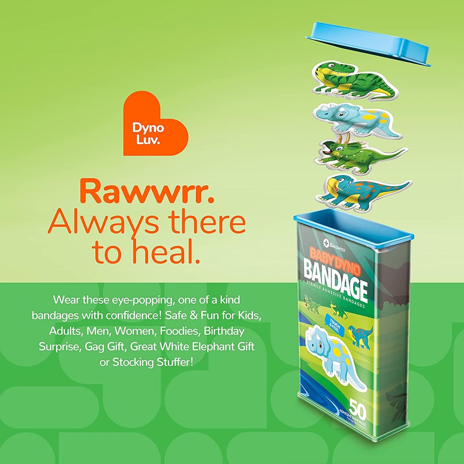 - 50 BABY DINOSAUR KIDS BANDAGES: Fun baby dinosaur-shaped adhesive bandages tin helps protect cuts, scrapes, and minor wounds while making healing less stressful for children; bandages come in 4 assorted styles