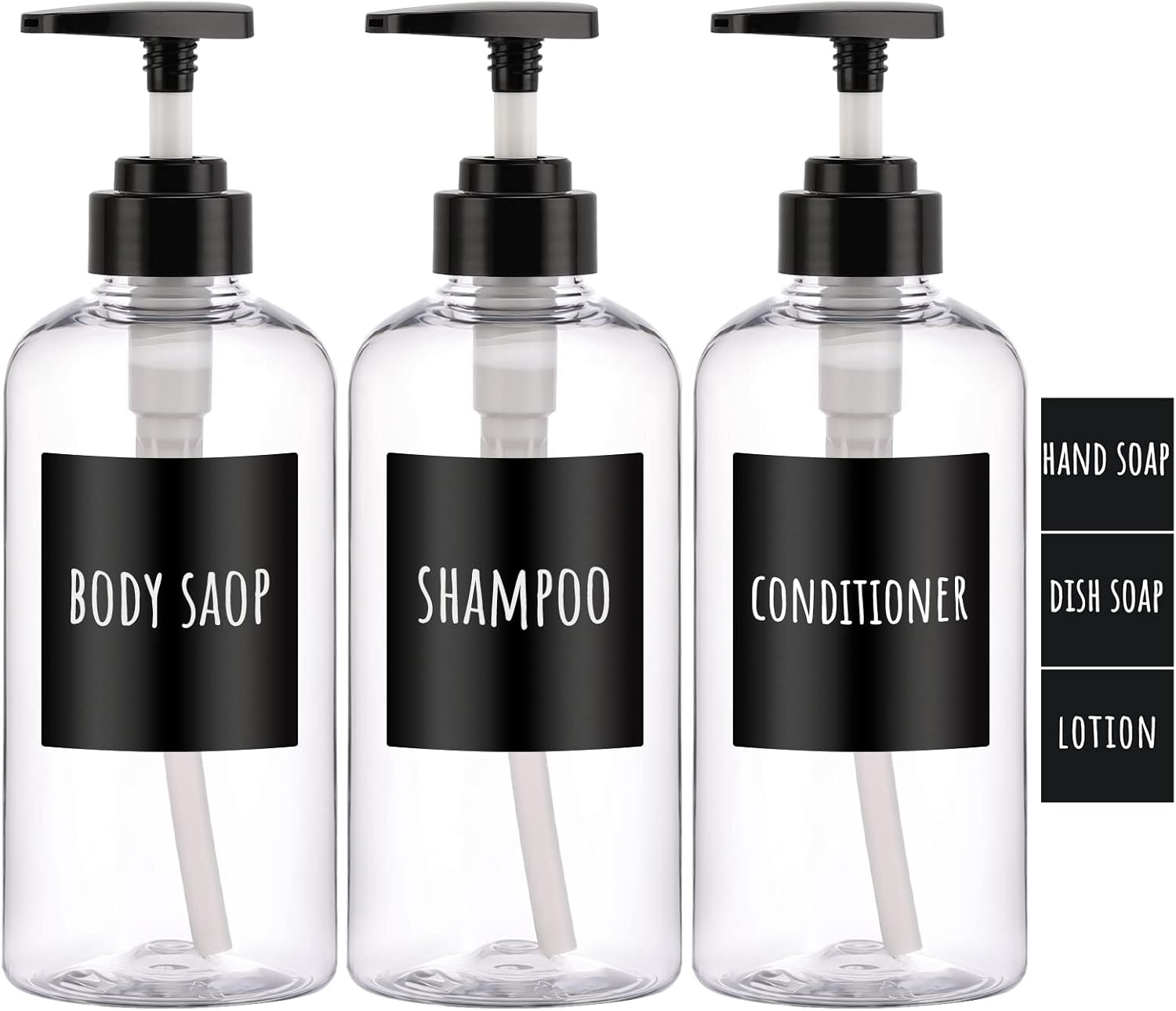 - 【Large Capacity with 6 Water-proof SELF-LABELING Stickers】 Set of 3 packs dispenser bottles, each holds 16.9oz large capacity to meet the whole family essential need. 6 separate water-proof label stickers BODY SOAP, SHAMPOO, CONDITIONER, HAND SOAP, DISH SOAP, LOTION are NOT pre-stuck on the bottles, you can stick them for your free choice.