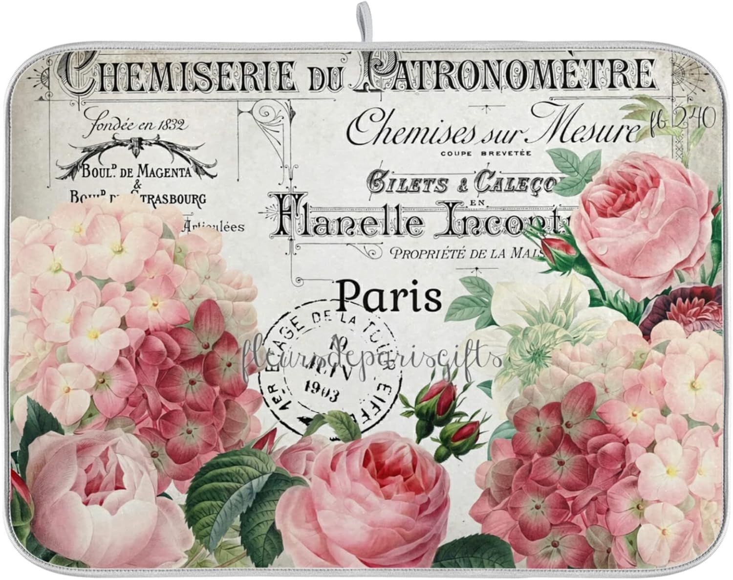 Vintage Pink Rose Flower Dish Drying Mats for Kitchen Drying Mat 16 x 18 Inch Absorbent Microfiber Drying Dish Mat Machine Washable Dish Rack Pad Dish Drainer Mat