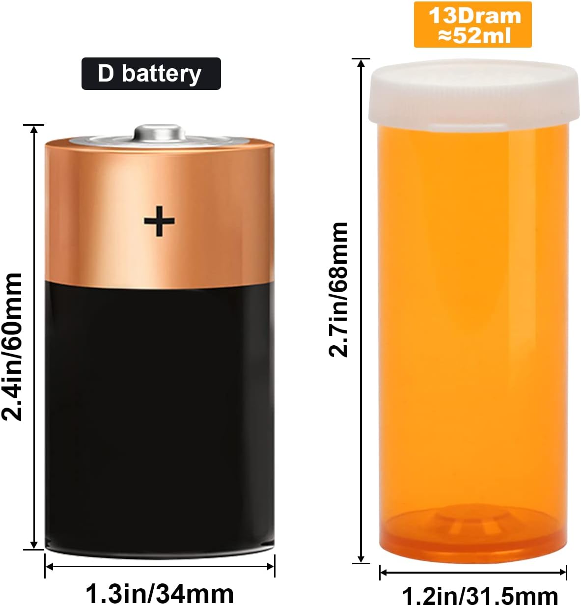 - Perfect Size: Each small plastic prescription vials measures approximately 1.2 x 2.7 inches (31.5 x 68 mm), 13 dram ≈ 52 ml.
