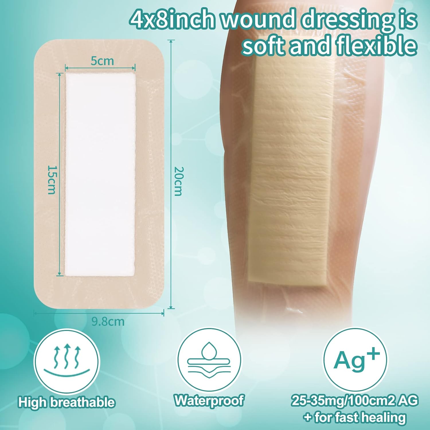 Dimora Silicone Foam Dressing Silver Ag 4"x 8" Adhesive Absorbent First Aid Bandage for Wound Care Pads 5 Packs