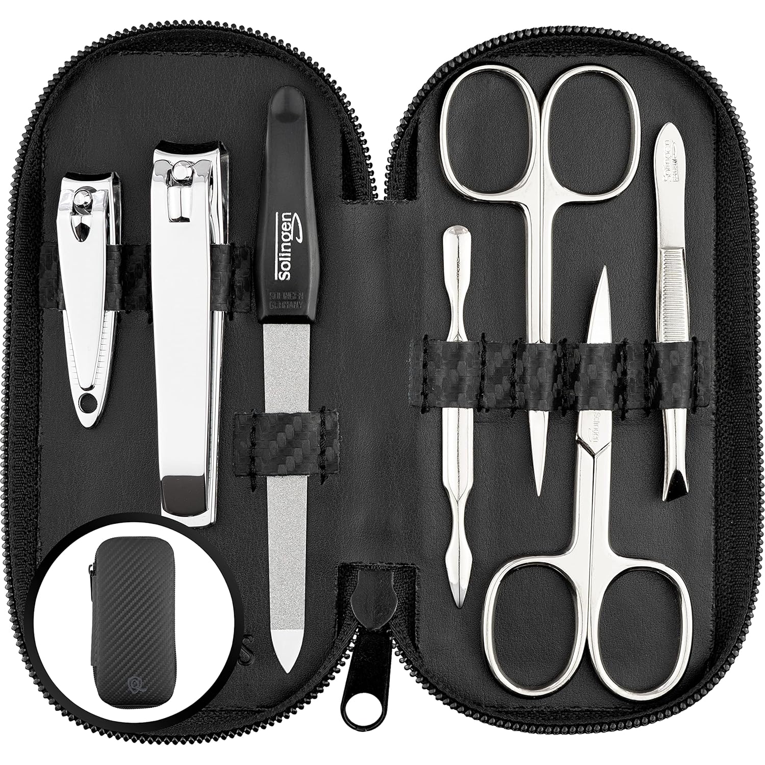 Manicure Set Solingen Made in Germany - 7 Piece Exclusive Finger & Toe Nail Clippers Kit for Women and Men in Vegan Leather Case, Color Carbon