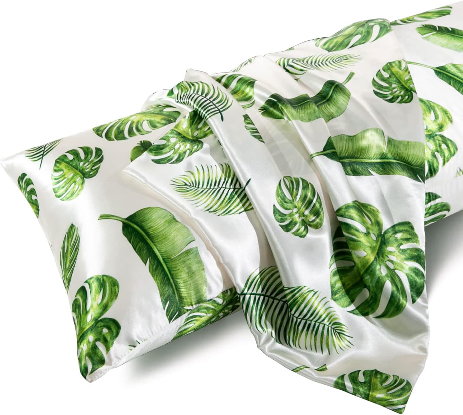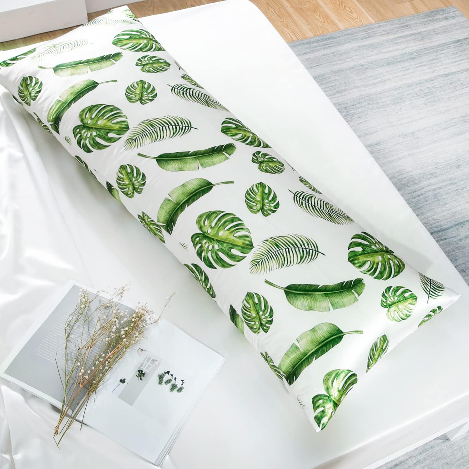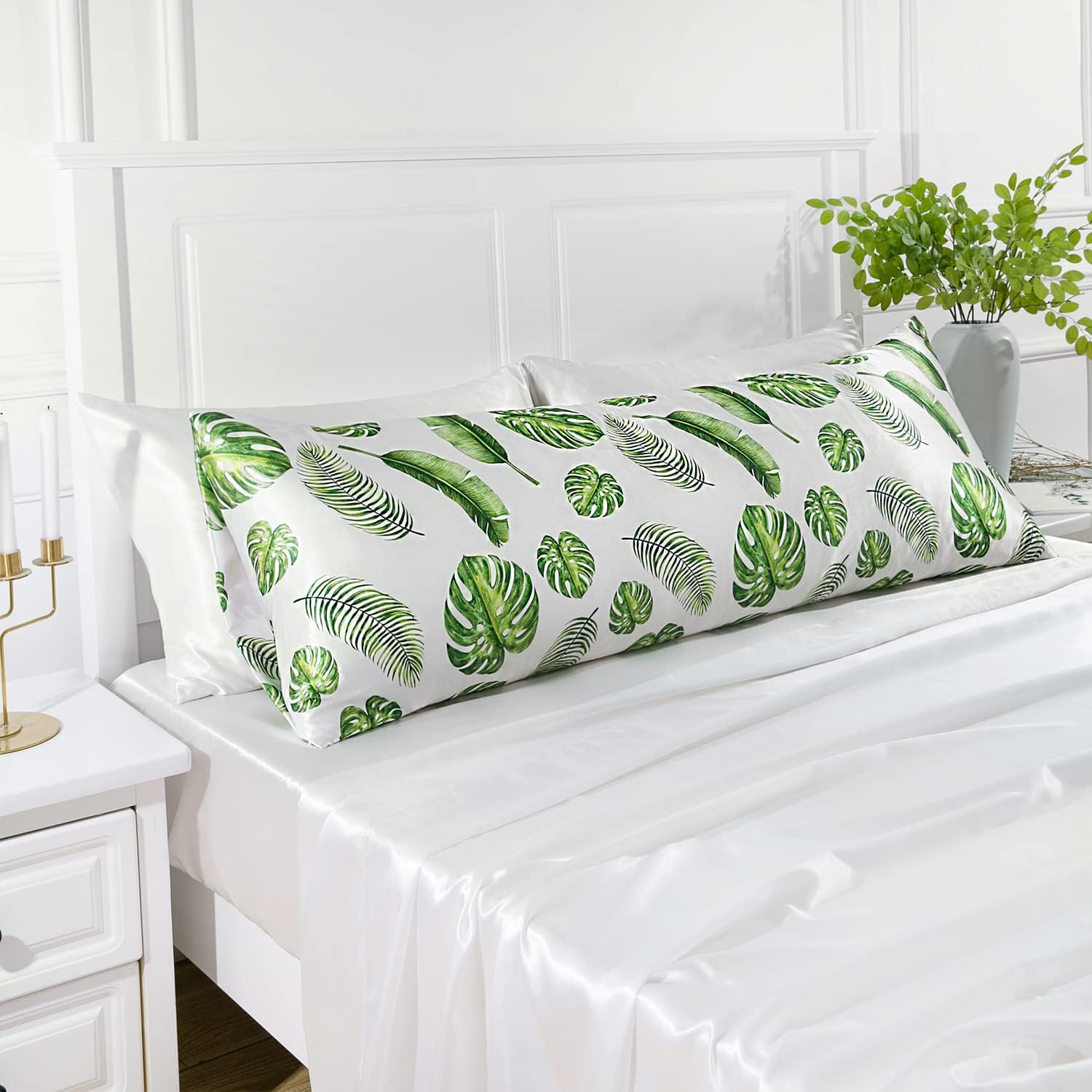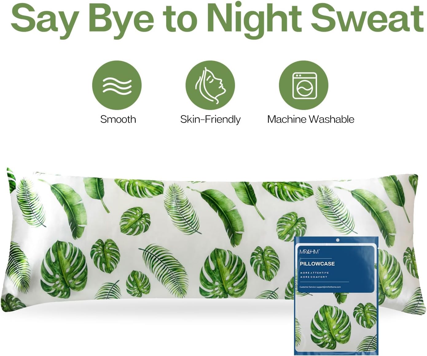 MR&HM Satin Body Pillow Cover, Soft and Breathable Body Pillow Case with Envelope Closure, Cooling and Silky Long Pillowcase for Hair and Skin,Grey (20x54, Leaves)