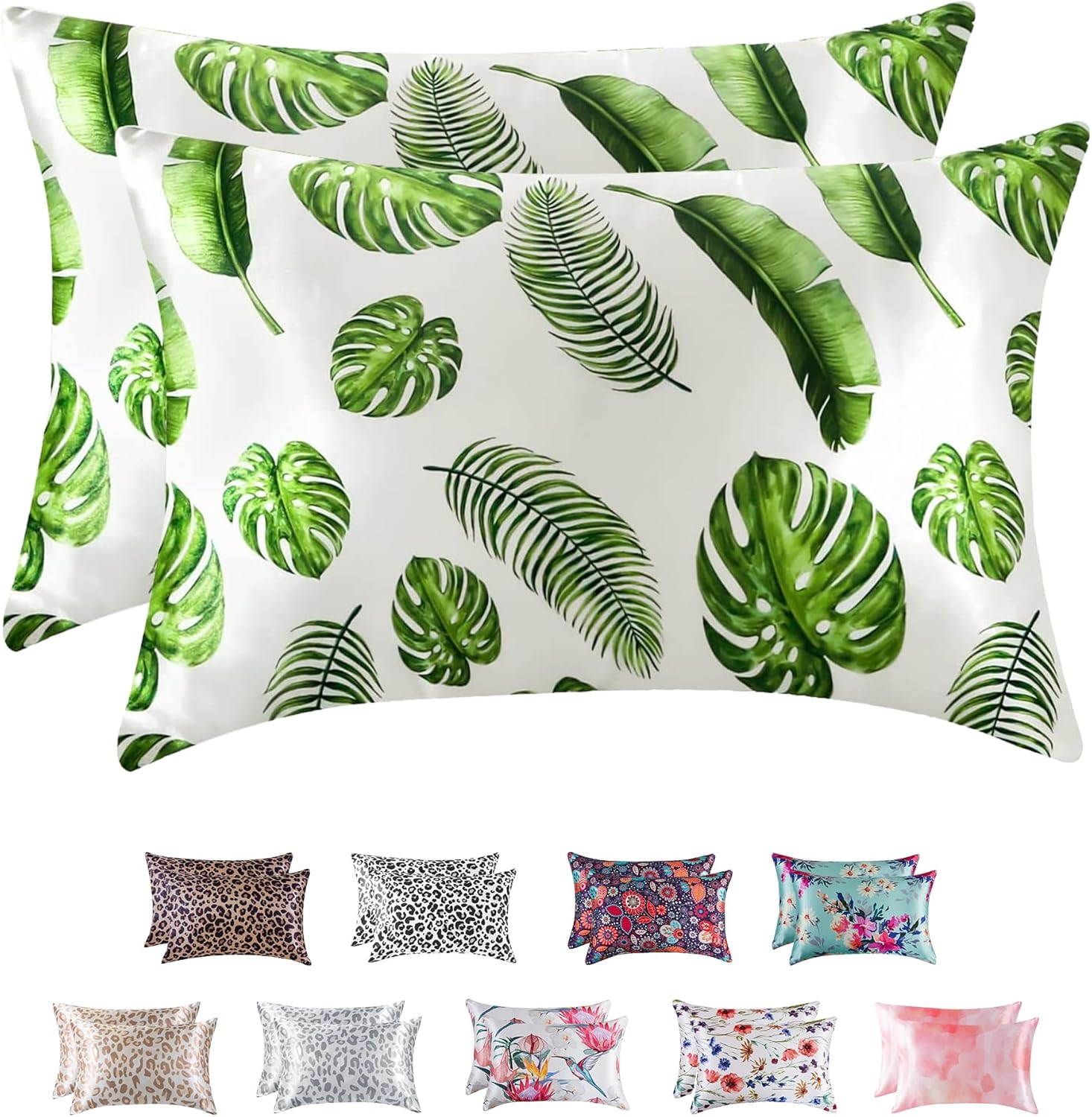 MR&HM Satin Pillowcase for Hair and Skin, Silk Satin Pillowcase 2 Pack, Standard Size Pillow Cases Set of 2, Silky Pillow Cover with Envelope Closure (20x26, Leaves)