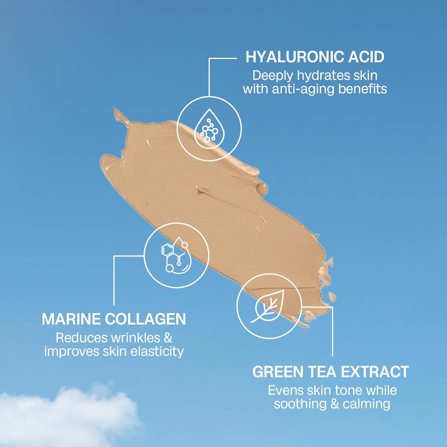 - ENRICHED WITH SKINCARE INGREDIENTS Enriched with green tea, hyaluronic acid and marine collagen to rejuvenate and renew the skin. It's lighter than a foundation but provides more coverage and benefits than a tinted moisturiser.