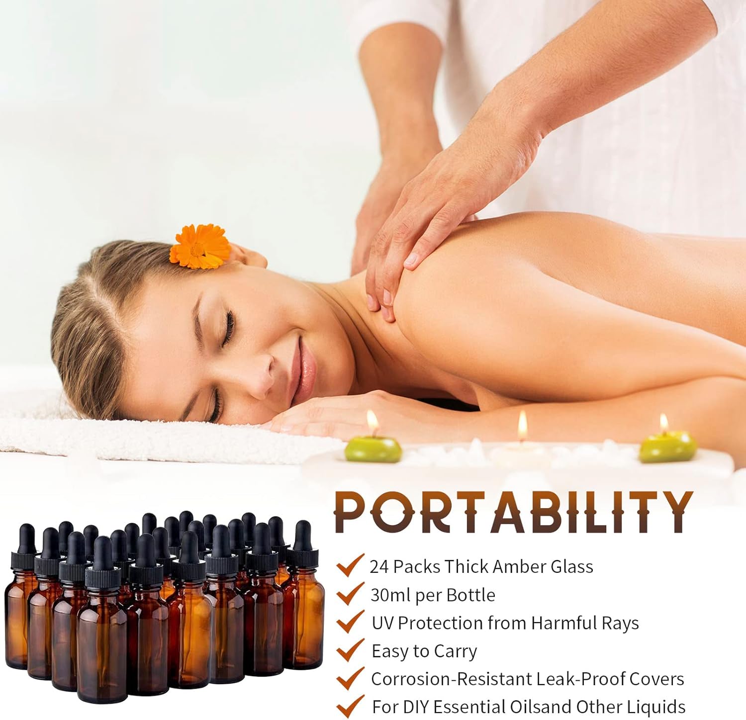 24 Pack Amber Glass Dropper Bottle, 1 oz, with Measuring Eye Dropper, Leak Proof Travel Dispenser Bottle for Essential Oils/Chemistry Laboratory Chemicals/Cologne and Perfume