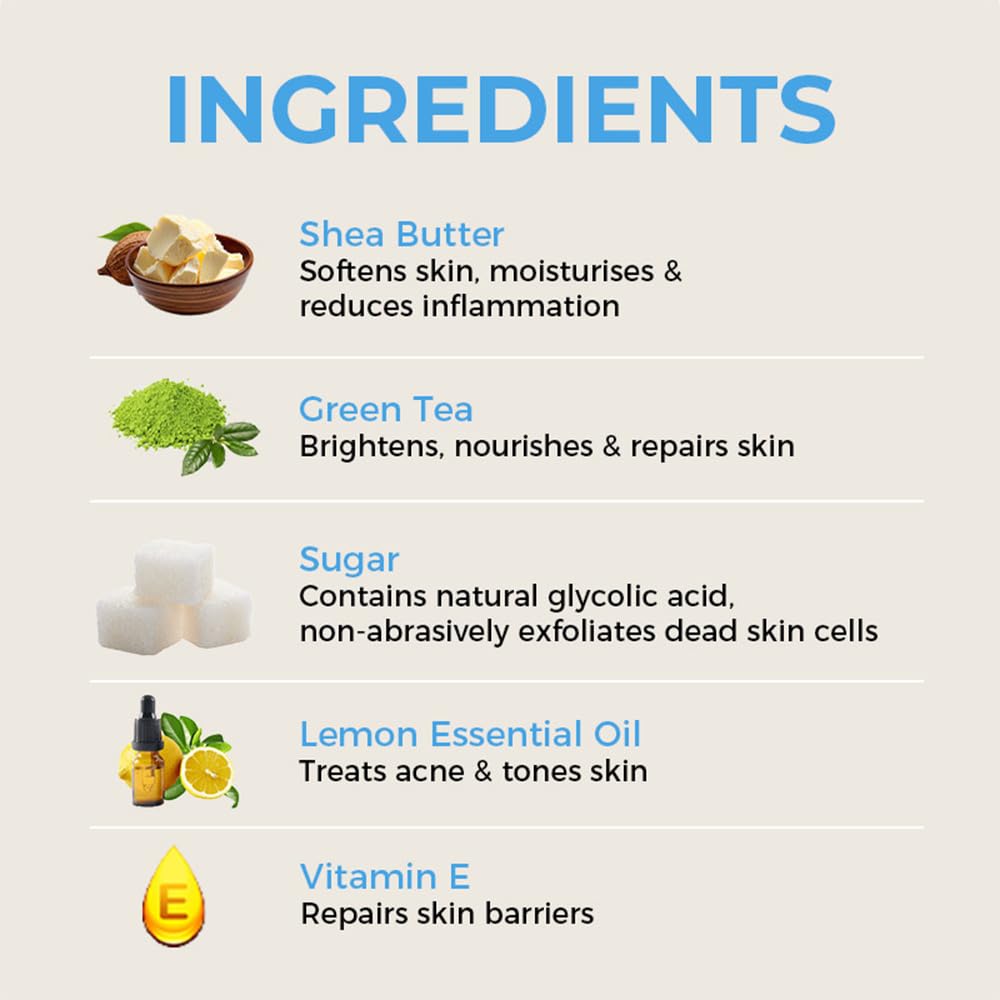 - Bid goodbye to dull & tanned skin with green tea body scrub that contains lemon and moisturizing raw sugar. A fragrant addition to your skincare routine. Whipped sugar scrubs have a rich, foaming lather as well as gently exfoliate. They offer ample moisture, ensure clean skin & remove all dead skin cells.