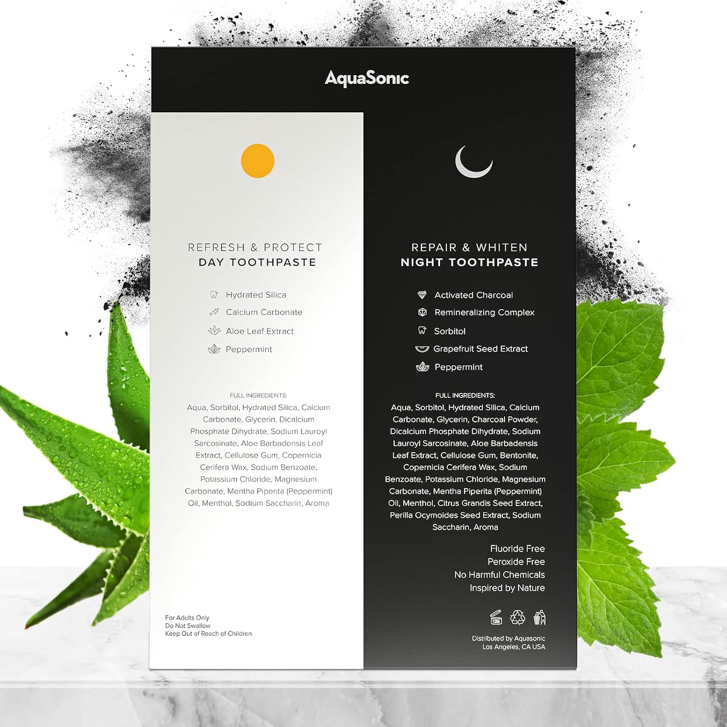 - Clean, Healthy and Unique Formulas: Fluoride-free, peroxide-free, no harmful chemicals, and inspired by nature. The Complete Care Day & Night Toothpaste system by trusted American brand Aquasonic is the ultimate solution to affordably treat your teeth, gums, breath, and whiten your smile like never before.
