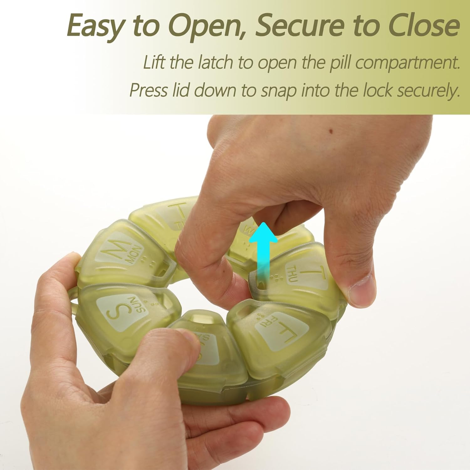 - Easy To Use - Two easy way to open the 7 day pill box,one is push on hinge towards the center,another is reach under the latch and pull upwards.(the main picture has a graphic introduction)