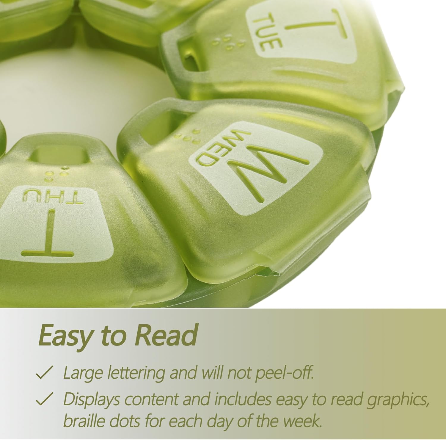 - Comes with Large Lettering - The daily pill box organizer also comes with large lettering and include braille dots to help you distinguish the medicines stored in each compartment more clearly and simply,large high quality printed days that will never peel off, include braille dots.