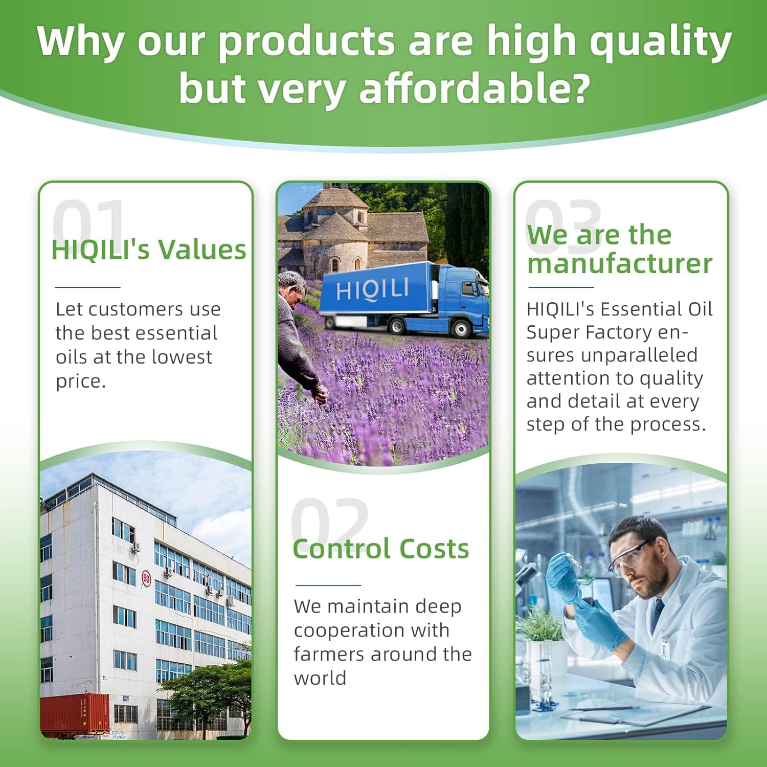 - About HIQILI: We work with farmers in more than 30 countries around the world to achieve sustainable development by providing cost-effective essential oils to meet the needs of today's consumers