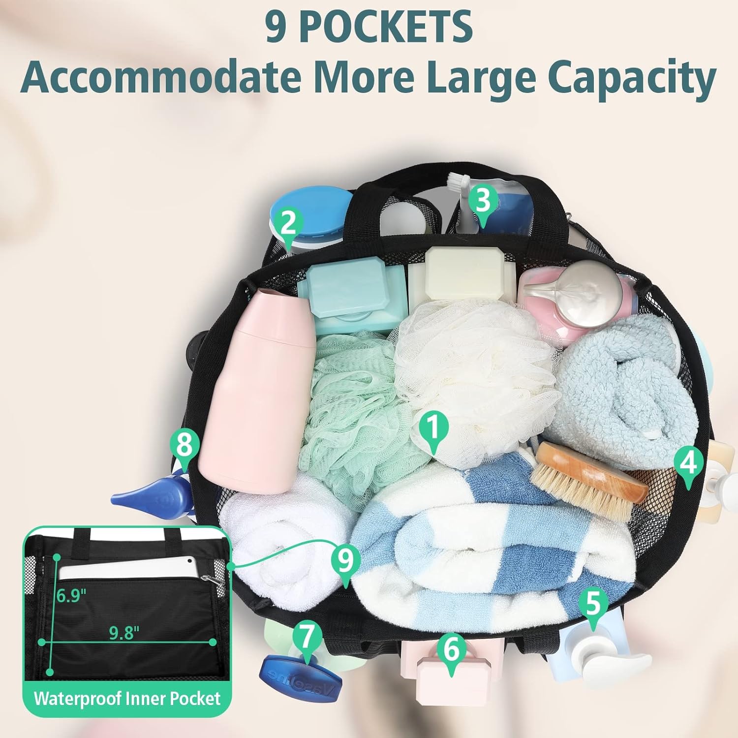 - Large Storage Capacity: The mesh shower caddy is an extra large version, size: 11" x 7.9" x 11.8"; 7 exterior pockets, 1 inner pocket, and 1 large center section can store full-size shampoo, body wash, soap, toothbrush, blow dryer or other bathroom essentials