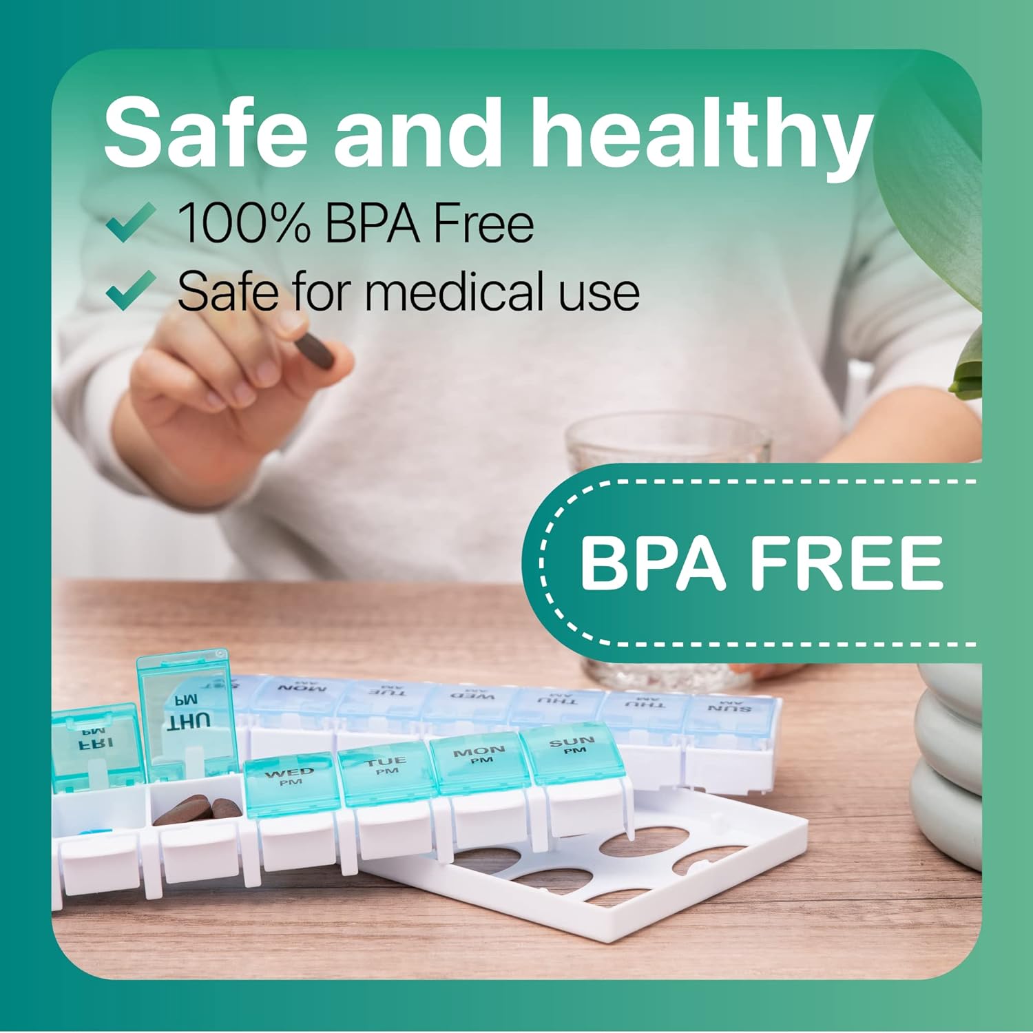 Sukuos AM PM Weekly 7 Day Pill Organizer, 2 Times A Day Pill Box with Arthritis Friendly Push Button, Medicine Cases for Vitamin/Fish Oil/Supplements, Easy to Clean (Cyan&Blue)