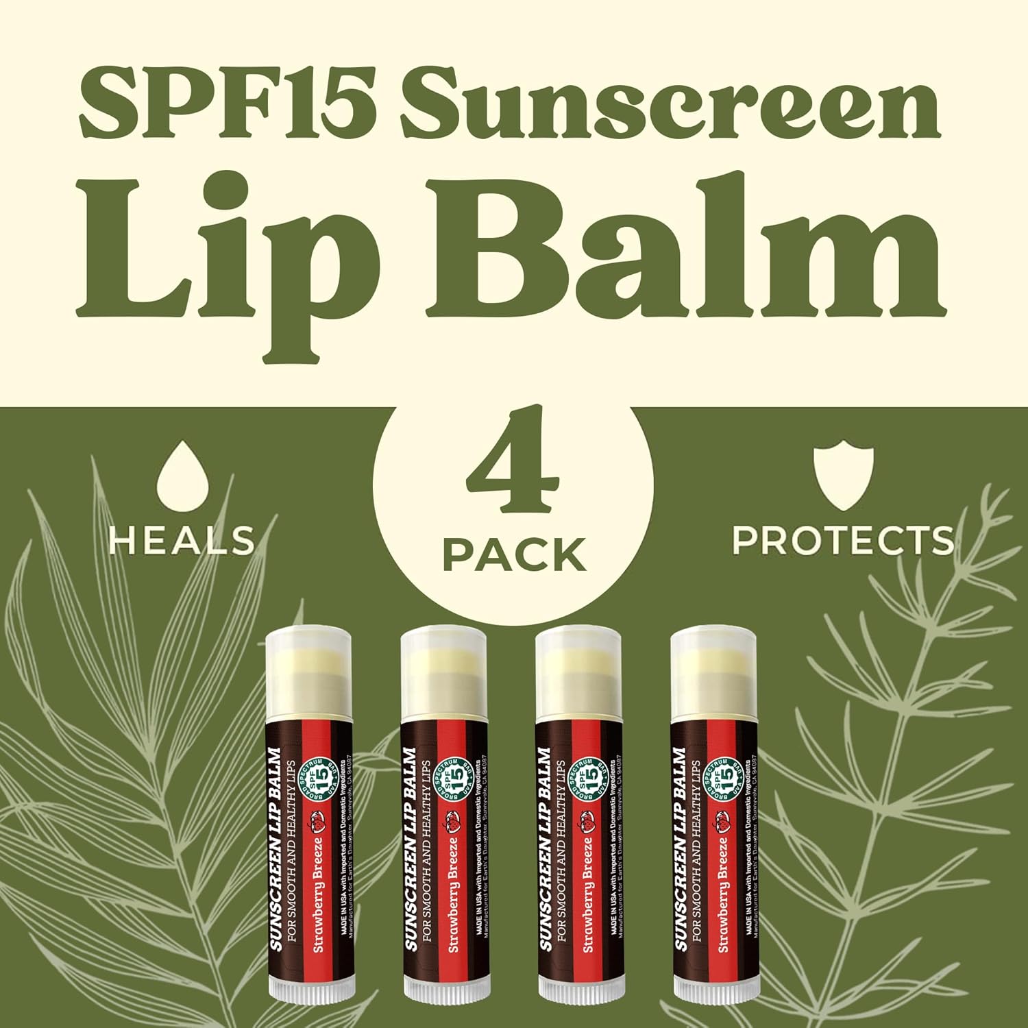 - 4 PACK of SPF 15 SUNSCREEN LIP BALM – Delicious Strawberry Flavor. Everyone loves our strawberry lip balm with SPF 15 sun protection, organic beeswax, organic coconut oil and other premium organic hydrating ingredients to protect and moisturize all day long. Our lip balm is great for everyday protection and safe for the whole family