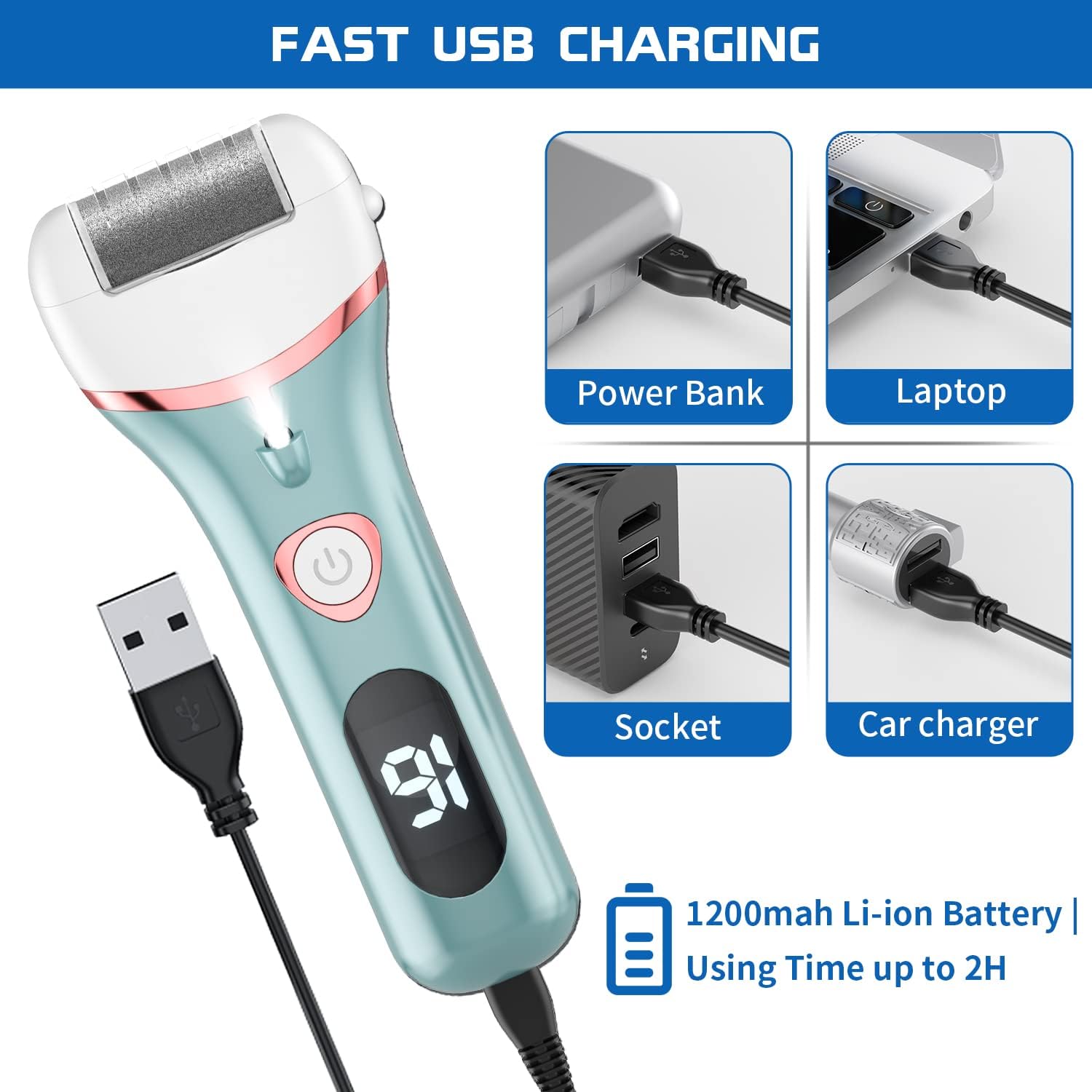 - 【Rechargeable & Equipped with Lcd Digital Battery Display and Light】The electric foot file with high quality 1200mAh large capacity lithium battery can working for about 60-90 Minutes. Only charge about 2-3 Hours. And it equipped with lcd digital battery display and light, you can see how much battery left and when to charge. Foot care for women, this foot scrubber dead skin remover's light turns on automatically while the foot file is working, shining light on your dead skin.