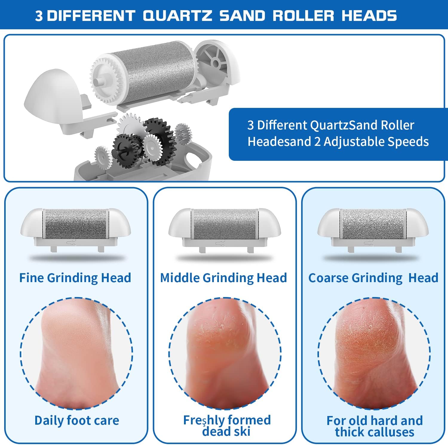 - 【Powerful, Safe & 2 Speeds Adjustable】This callus remover including 3 different quartz sand grinding heads, and have 2 speeds. 1700x/min when low speed and 2000x/min when high speed which applicable to different dead skins and calluses. It can easily to control, its speed as your request, fast or slow, more convenient and safer.