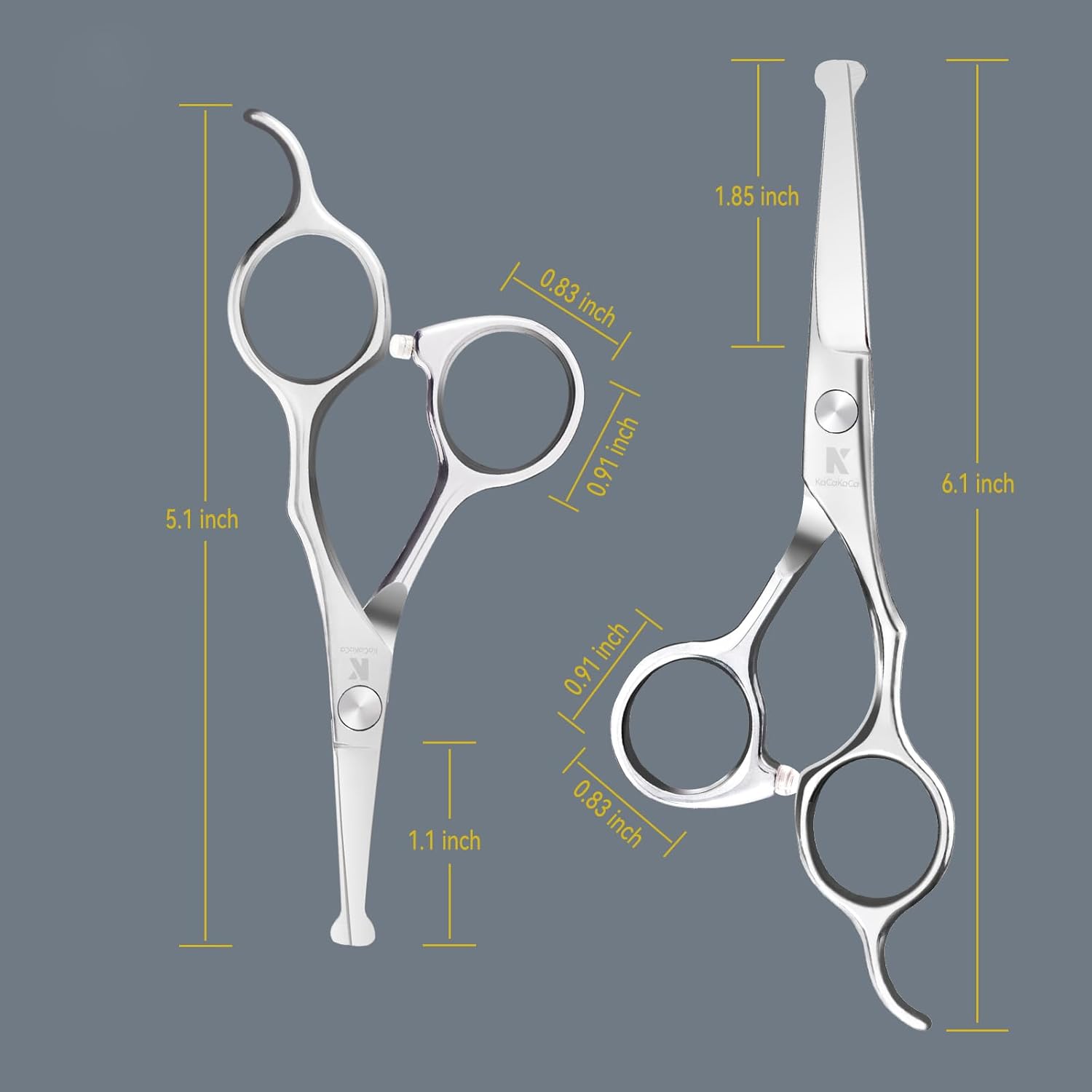 - 🔥MULTI-USAGE : Our Hair Cutting Kit includes: 1 pair of 6.1'' hair shears, 1 pair of 5.1'' hair scissors and a hair comb. The 6.1'' Toddler Hair Scissors measure 1.85'' sharp cutting blades, safe and easy to use on toddlers, babies, women and men, or used as dog grooming scissors. The 5.1'' Shears For Hair Cutting measure 1.1'' cutting blades is perfect for mustache, beard, face, ear, eye and nose hair