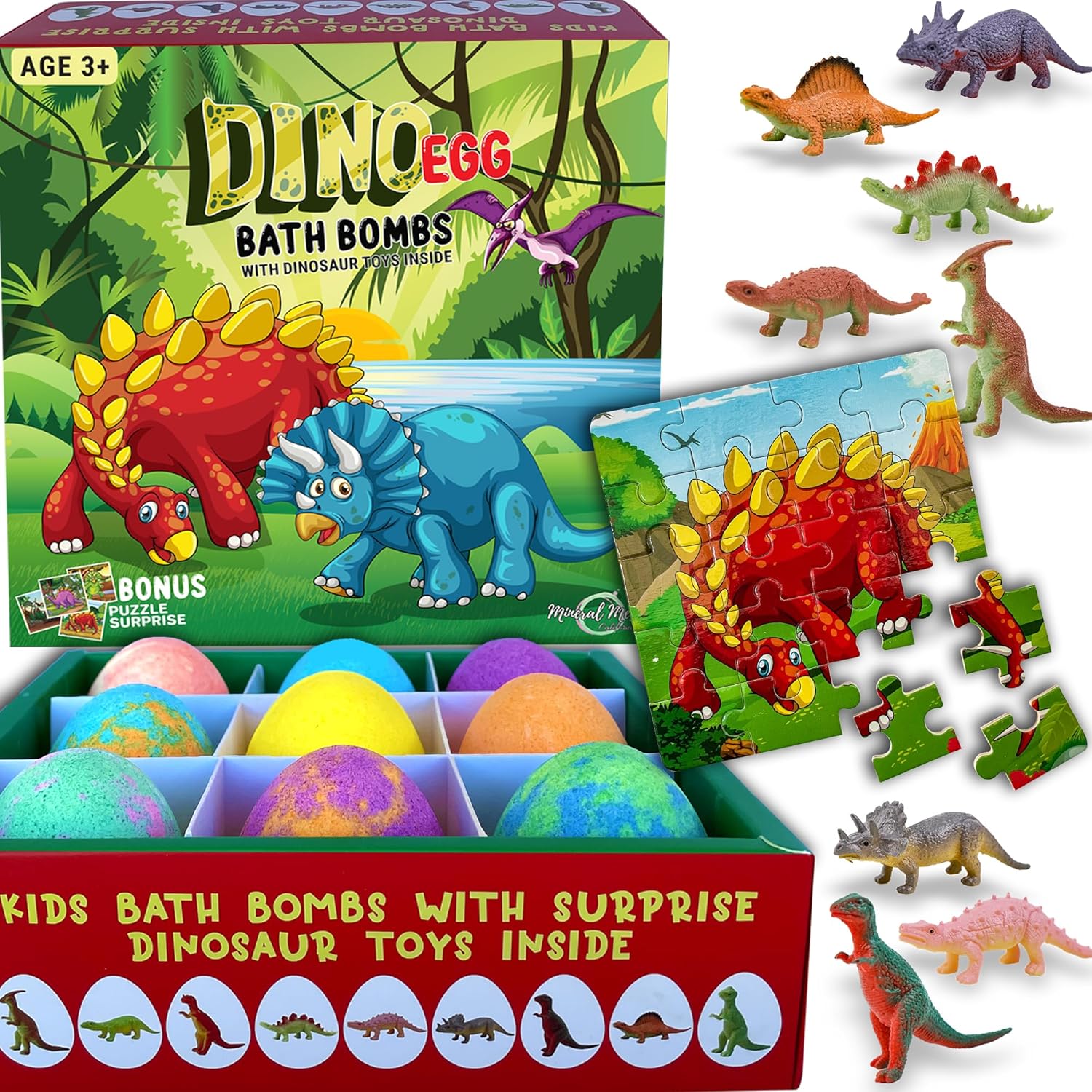 - Bathbombs & Puzzle In One -9 colorful KIDS BATH BOMBS with DINOSAUR TOYS and a bonus WOODEN JIGSAW DINOSAUR PUZZLE inside. a fun and educational gift for kids to develop creativity and imagination