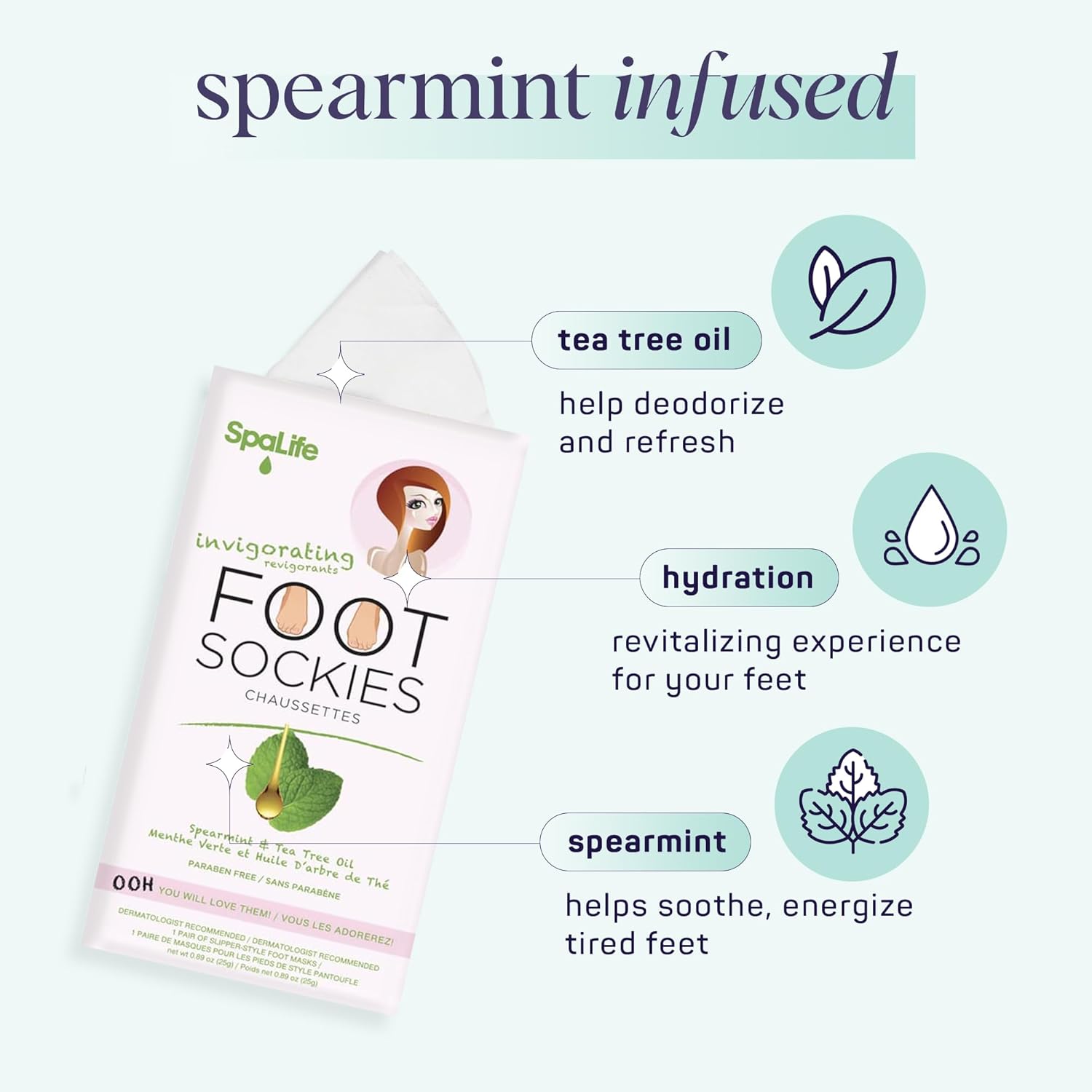 - SOFTER FEET: SpaLife's Spearmint & Tea Tree Oil Foot Sockies, set delivers instant softness and deep hydration. Say goodbye to dry, cracked skin and hello to the rapid joy of pampered feet.