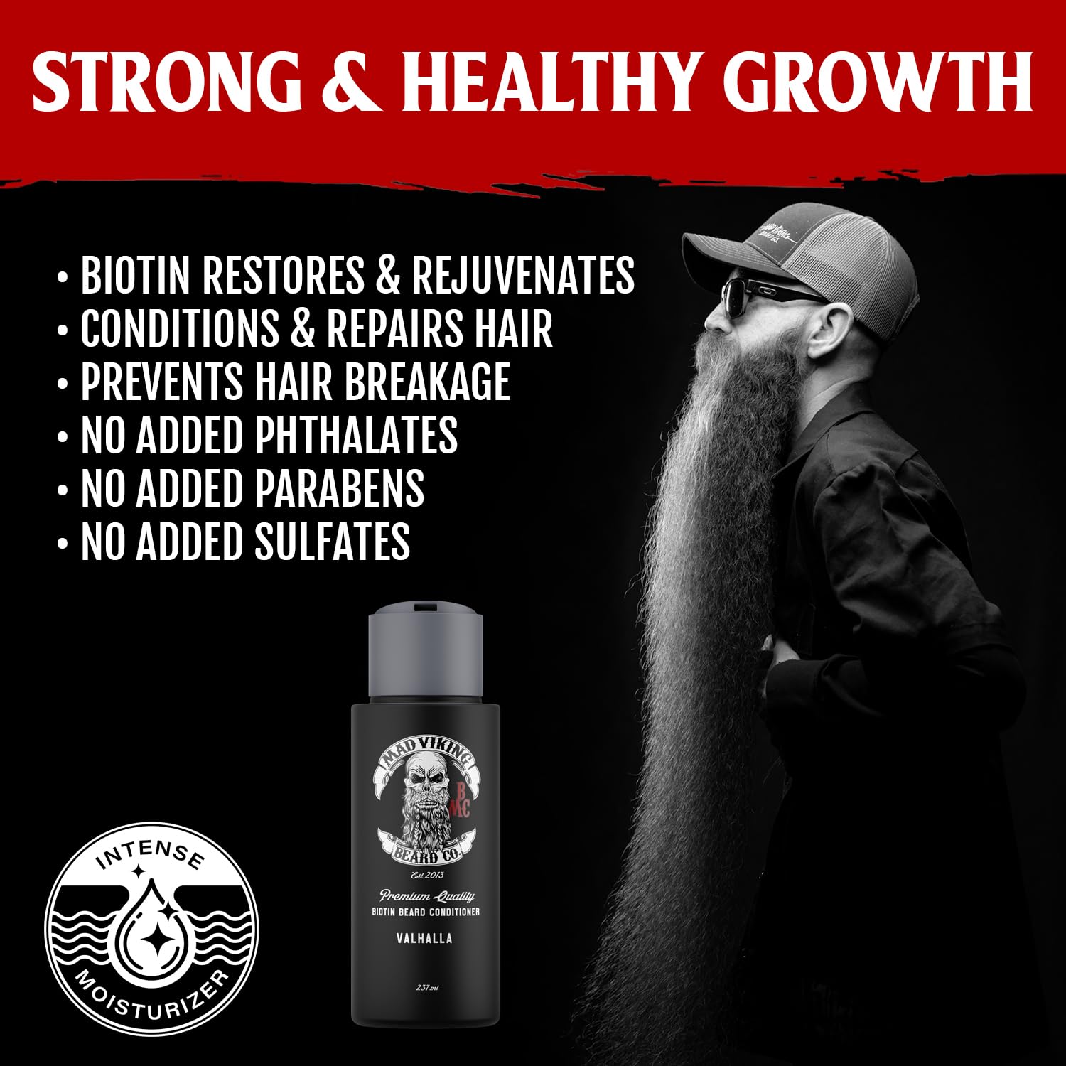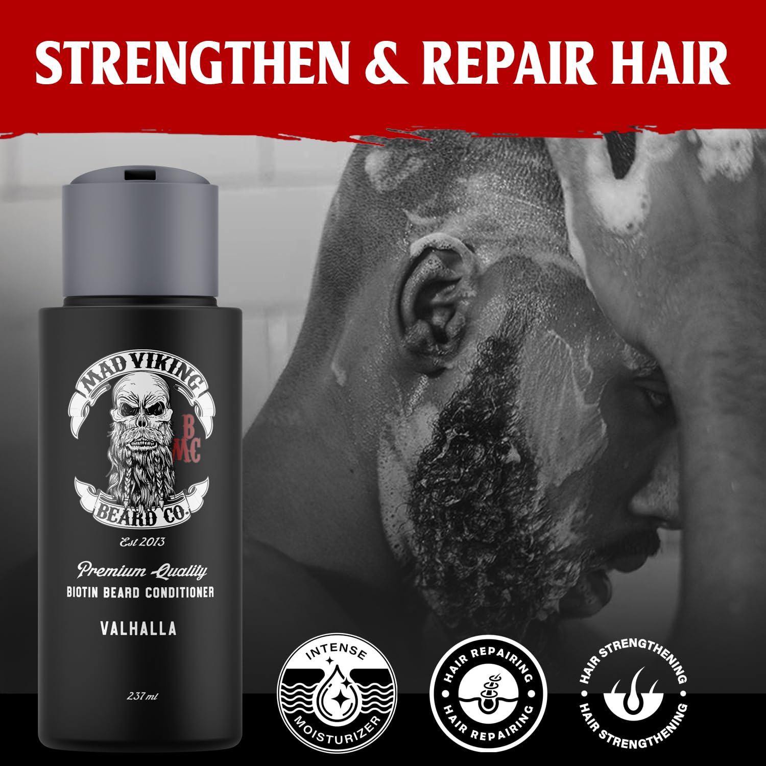 - Addresses Frizz & Tangles – Get rid of frizz with the Valhalla Biotin Beard Conditioner. Packed with Biotin, Provitamin B5, and Organic Korean Ginseng, this conditioner smoothes and strengthens your beard, taming unruly hairs. Olive, Jojoba, and Abyssinian Oils hydrate and soften, while Rice Protein adds fullness and shine. Suitable for anyone battling frizz, this formula leaves your beard looking smooth, healthy, and well-groomed every day. Pair with Valhalla Biotin Beard Wash for best results!