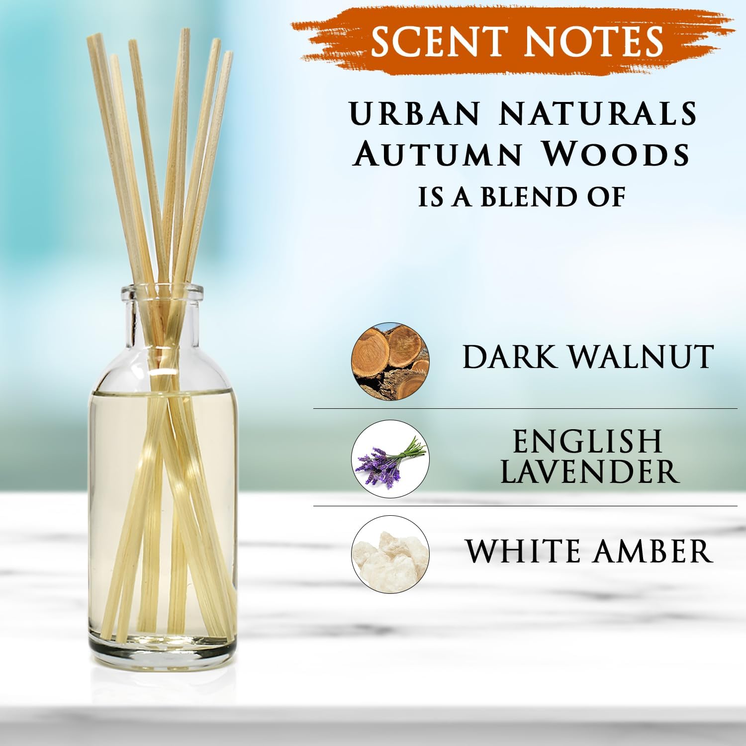 Urban Naturals Autumn Woods Reed Diffuser Set - Dark Walnut, English Lavender and White Amber - A Fresh, Earthy, Woodsy Fall Forage Scent - Made in The USA