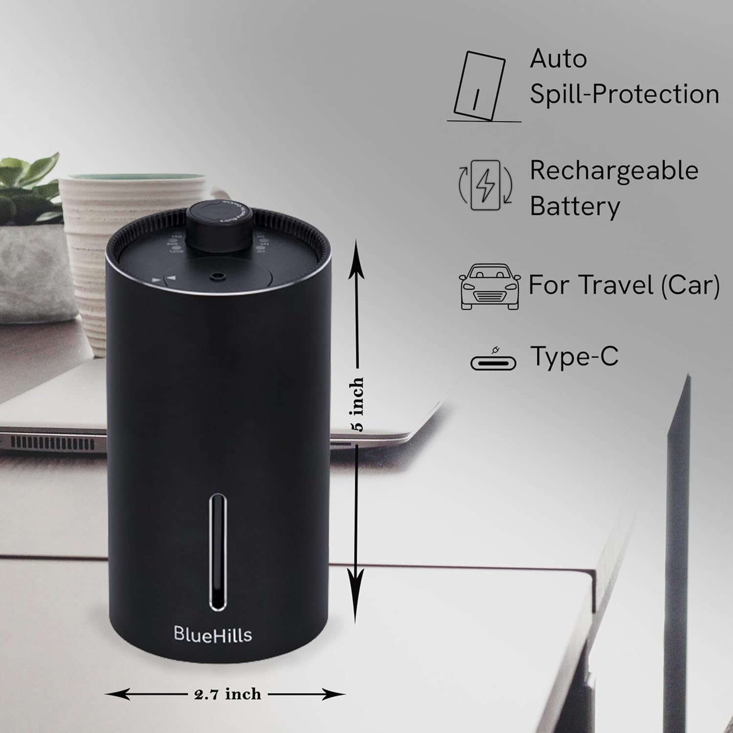 BlueHills Waterless Diffuser Cordless Car Essential Oil Aromatherapy Large Room Portable USB Travel Battery Operated Hotel Home Premium Mini Traveling Diffuser J03 Black