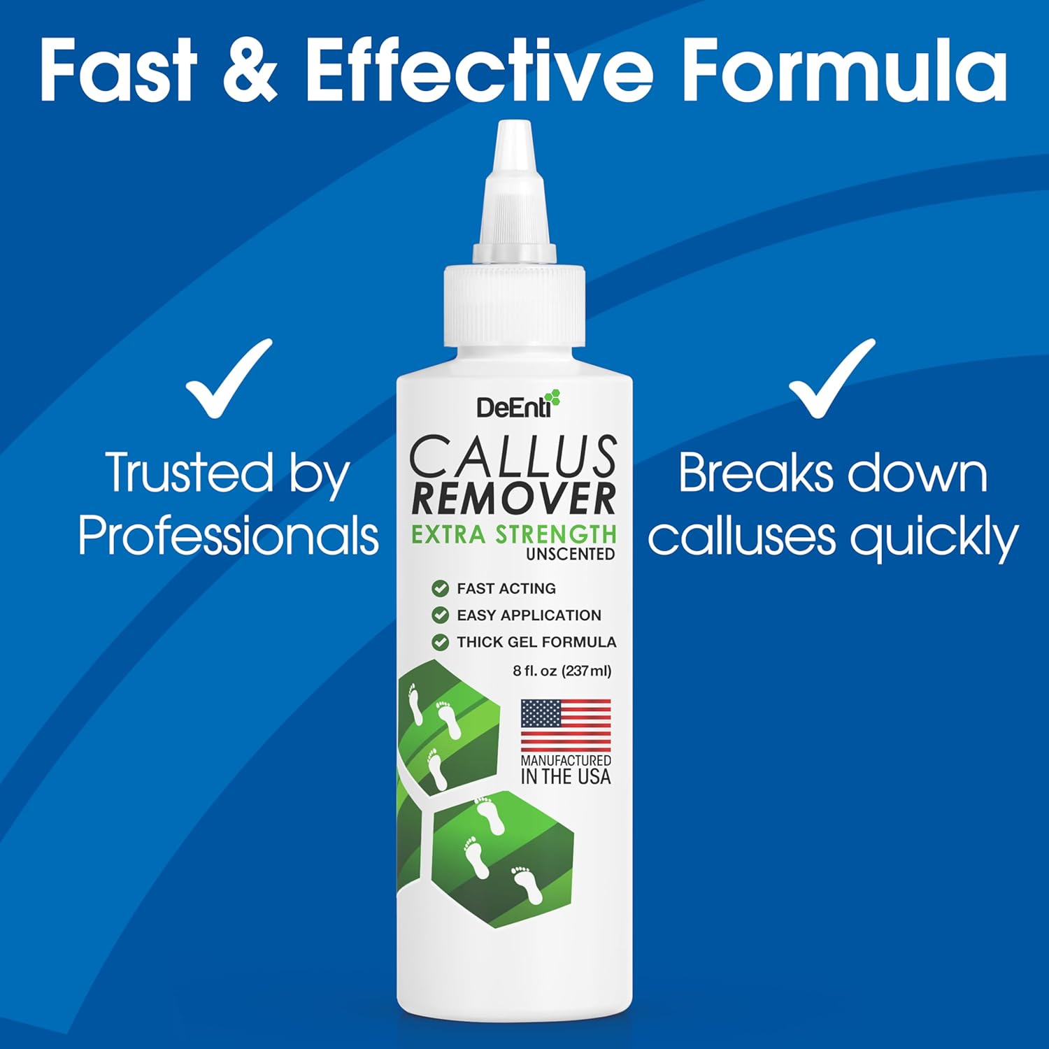- PROVEN, HIGH QUALITY FORMULA DeEnterprises' Professional Callus Remover Gel has been used daily in salons across the country for over 40 years! Family owned and Made in the USA. Purchase includes one 8oz bottle of Extra Strength Callus Removal Gel.