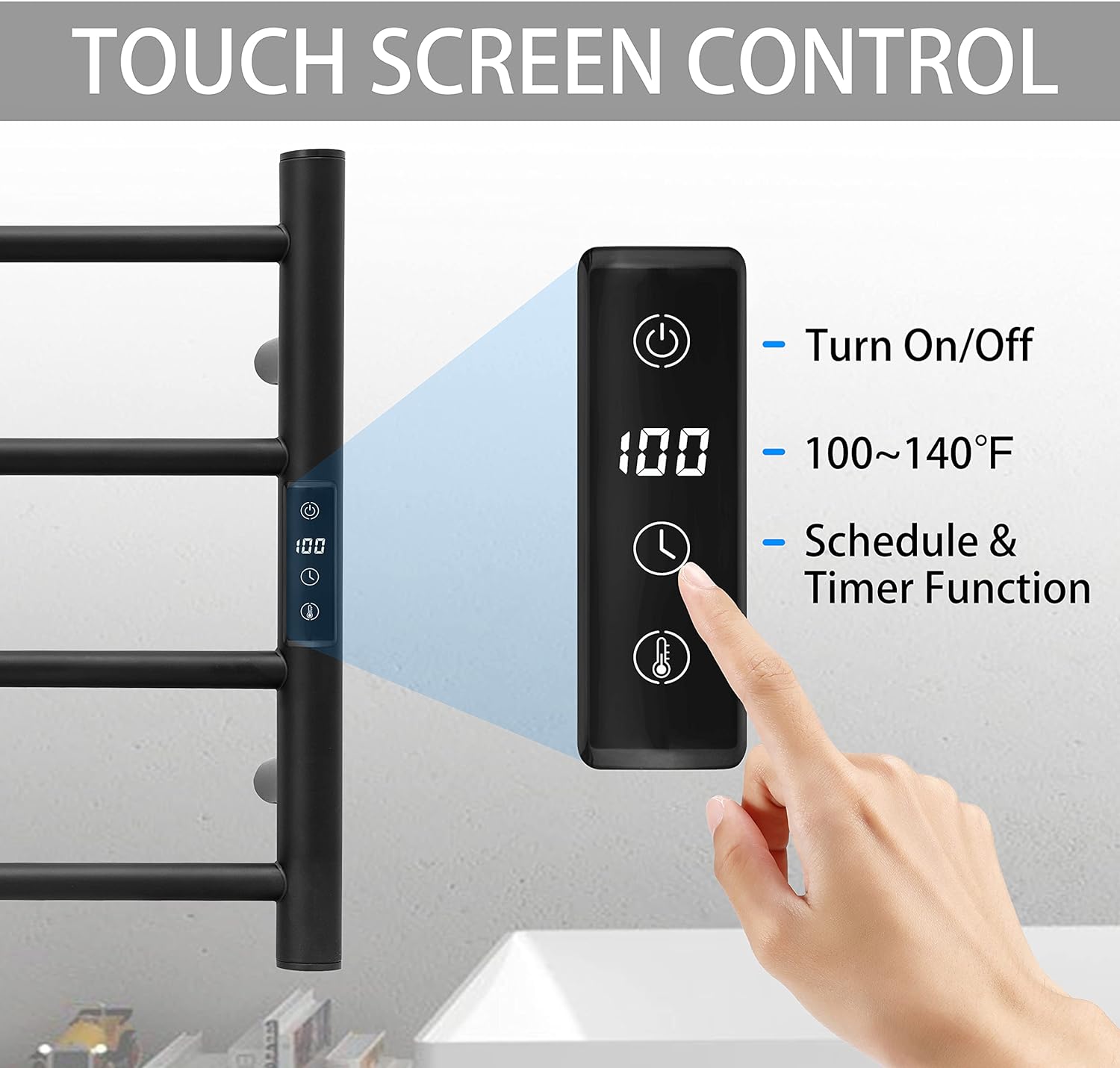 - [TOUGH SCREEN CONTROL]: Manually to turn on/off anytime. Countdown Timer function from 1 hour to 8 hours. Temperature control from 100°F to 140°F.