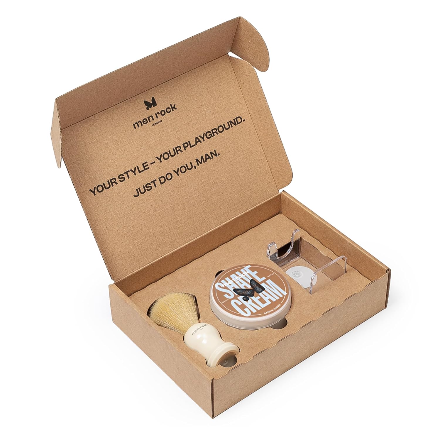 - Shave Cream Kit: The Men Rock Life Shaver Kit includes Sandalwood Shaving Cream, a synthetic shaving brush, and a clear drip stand. A must-have for your men's beard care routine, it’s tailored for smooth shaving and well-groomed beards.