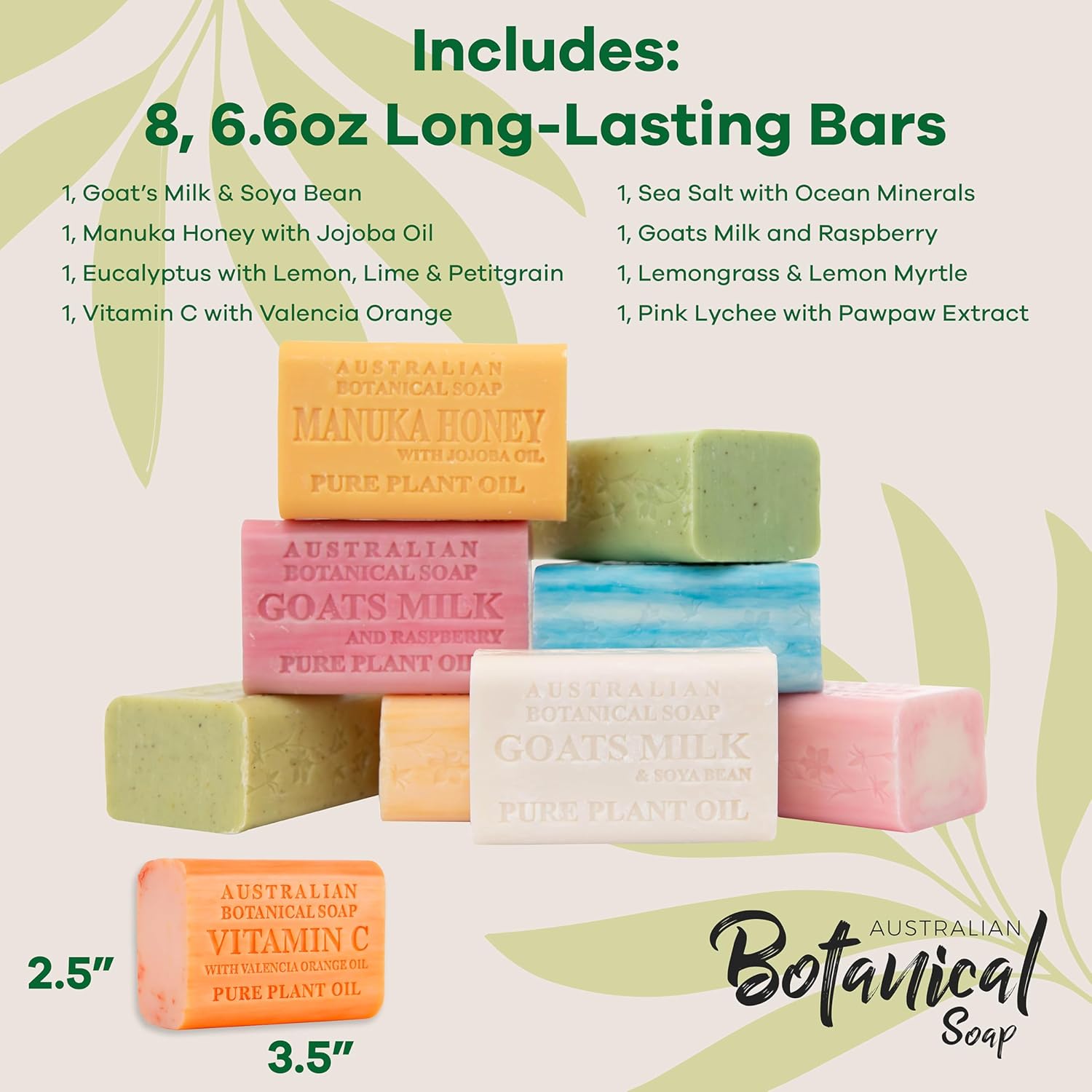 - Long-Lasting, Vibrant Fragrances - We have searched long and hard to find the most luscious scents, infusing each soap bar with a light, yet long-lasting fragrance. We have captured the essence of Australia with our 8-soap bar variety pack. Includes one of each 6.6 oz soap bar: Goats Milk & Soya Bean, Lemongrass & Lemon Myrtle, Valencia Orange with Vitamin C, Goats Milk with Raspberry, Eucalyptus, Sea Salt with Ocean Minerals, Manuka Honey with Jojoba Oil, and Pink Lychee with Pawpaw Extract.
