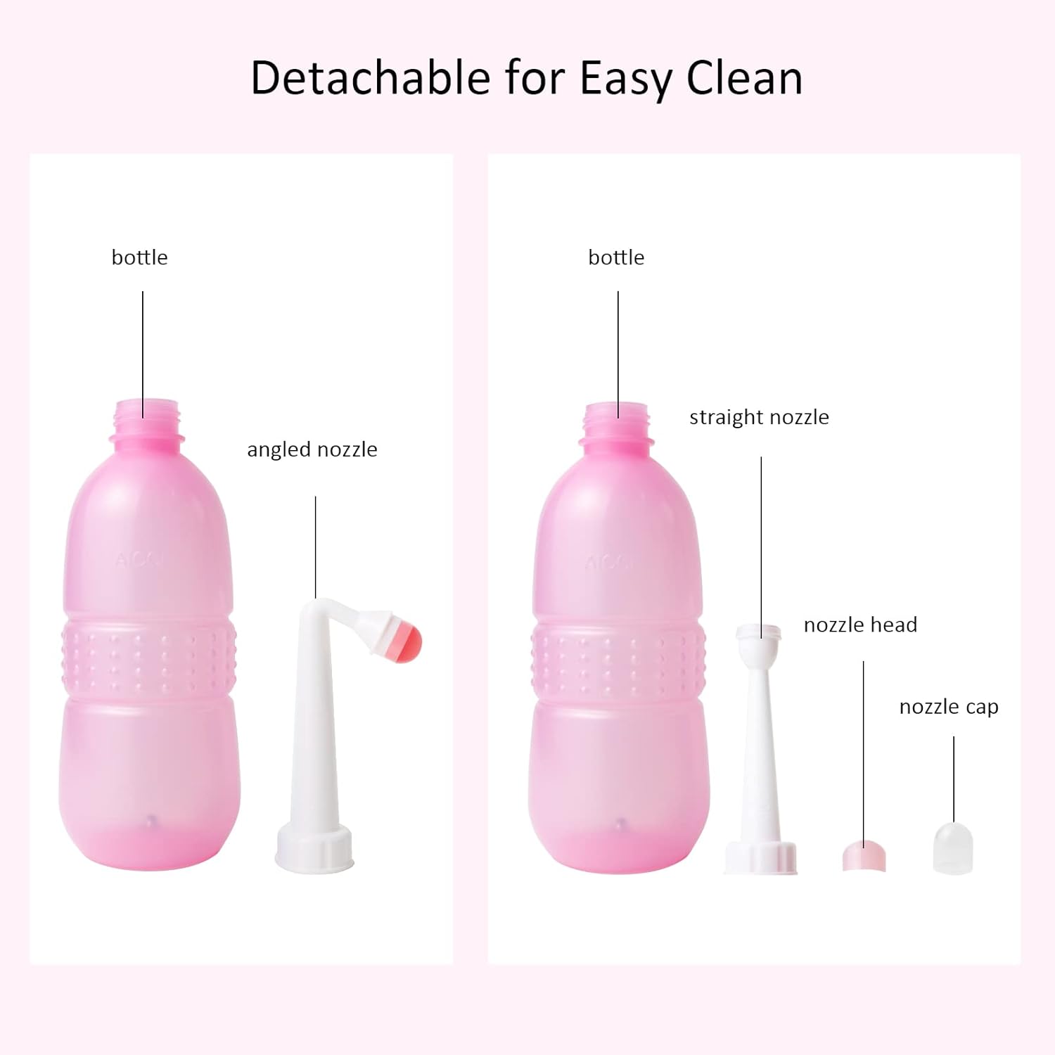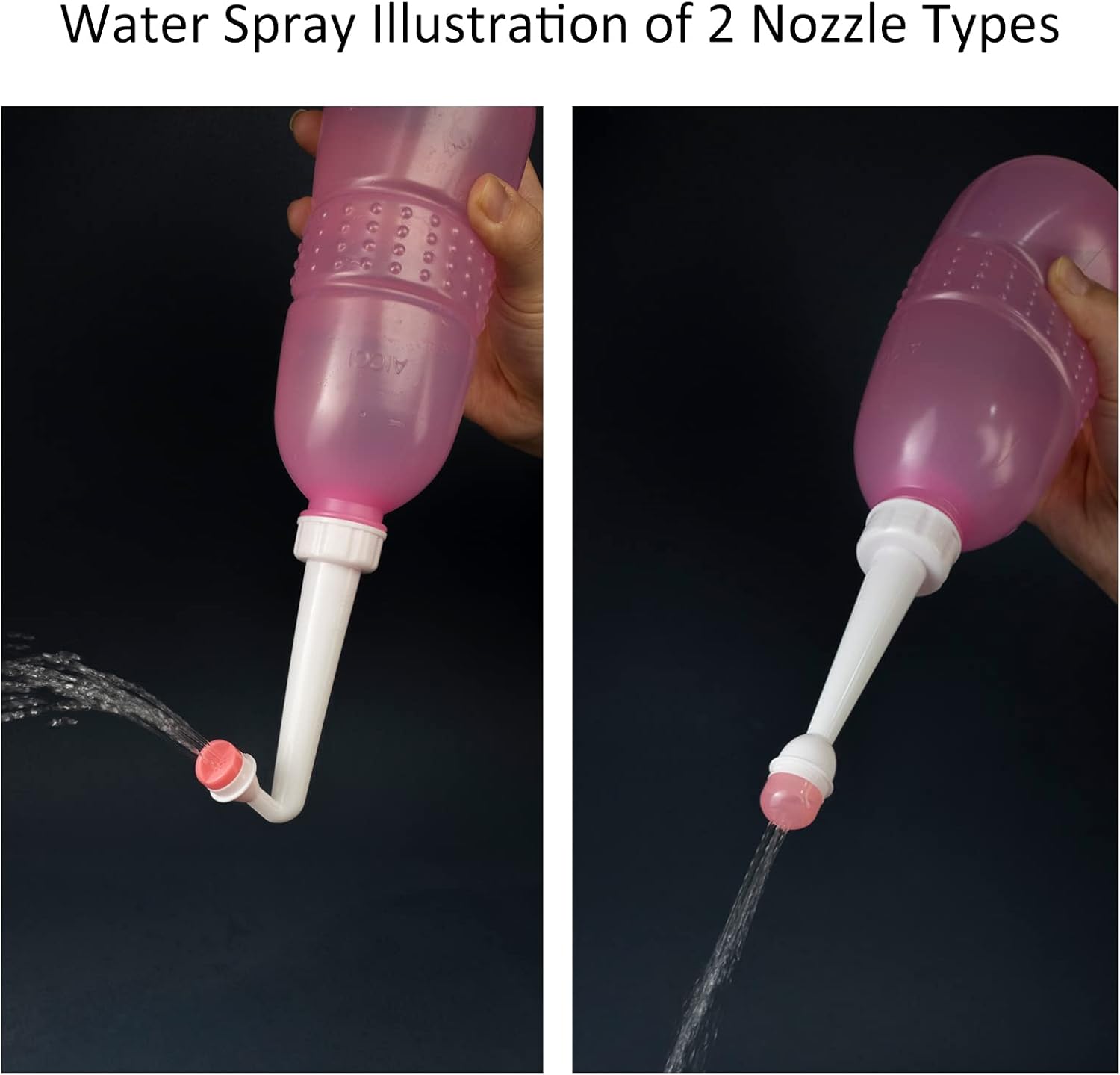 - 2 Nozzle Types that Fulfill Different Cleaning Needs - Please note, for “Pack of 1”, the peri bottle comes with only 1 angled nozzle, for “Pack of 2“, each peri bottle comes with 1 angled nozzle and 1 straight nozzle. Wide-spraying angled nozzle is more suitable for perineal cleaning with the bottle held upside down and can get perfect aim for hard-to-reach areas, fast-spraying straight nozzle can be used for a quick wash for baby buttocks after pooping.