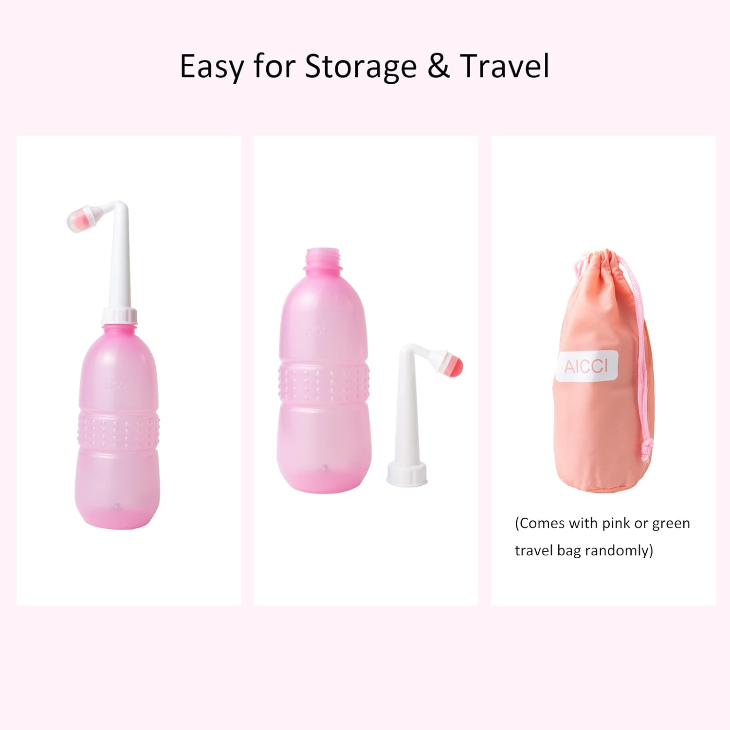 - Waterproof Travel Bag & Dustproof Nozzle Cap Included - Convenient for storage and also a portable bidet for travel. Please separate the bottle and spraying nozzle before storage. Comes with pink or green travel bag randomly.