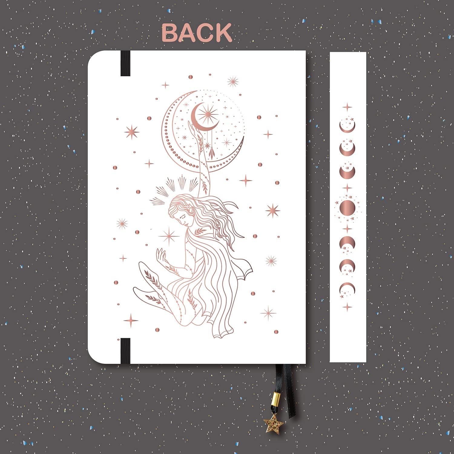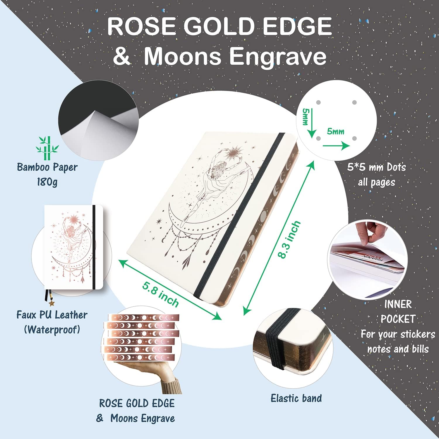 BUKE Medium A5 Hardcover Notebook Dotted Journal - 180Gsm Thick Bamboo Paper - 160 Dot Grid Pages 5x5 MM - White Color Faux PU Leather Cover - Rose Gold Edge And Moons (A5, White)