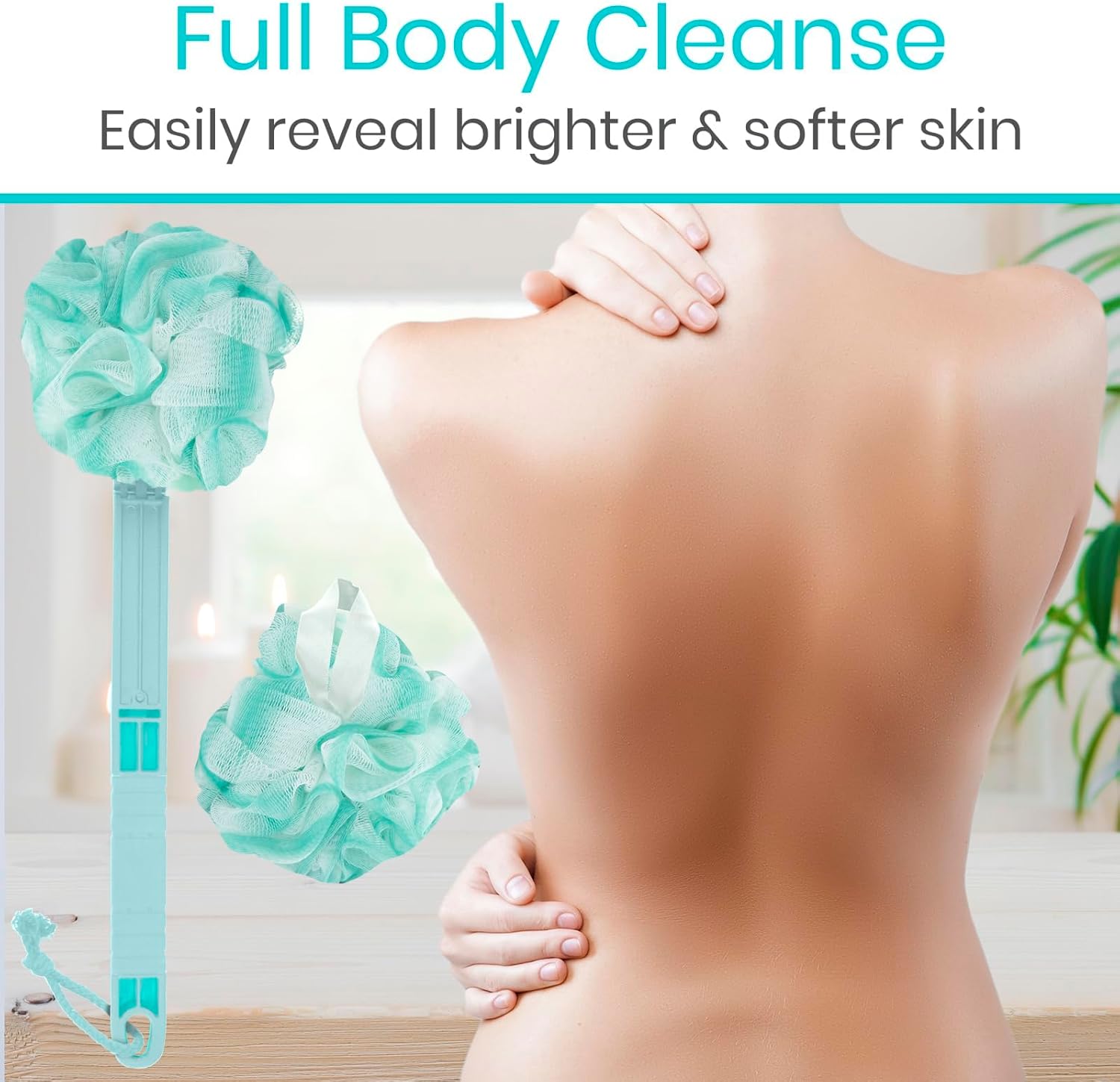 Vive Long Handled Loofah on a Stick - Mesh Back Sponge for Bath, Reusable w/Extra Pouf - Exfoliating Scrubber for Elderly & Disabled, Soft Loofa for Bathing Men & Women