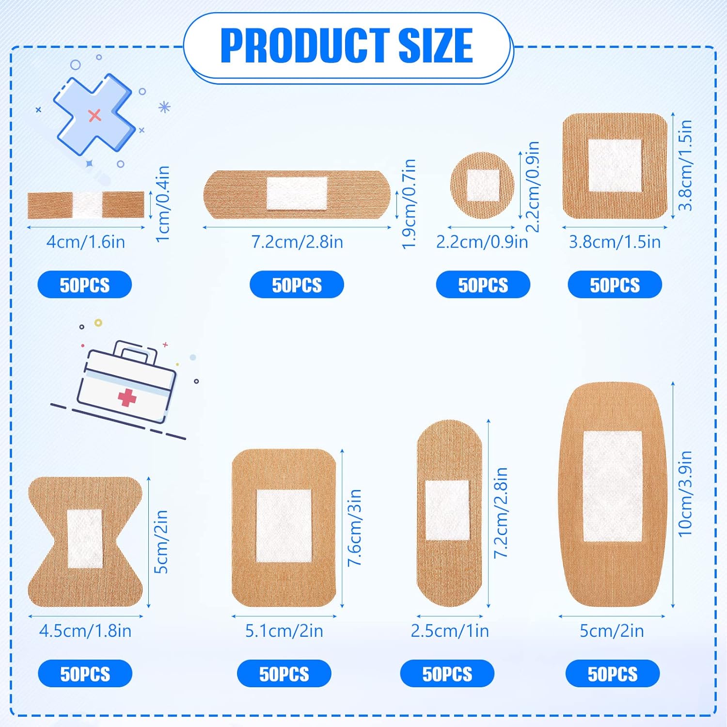 - Adhesive Bandage Set: you will receive 400 pieces of bandages, available in 8 styles, 50 pieces of each style, enough to secure many kinds of wounds, such as scrapes and burns