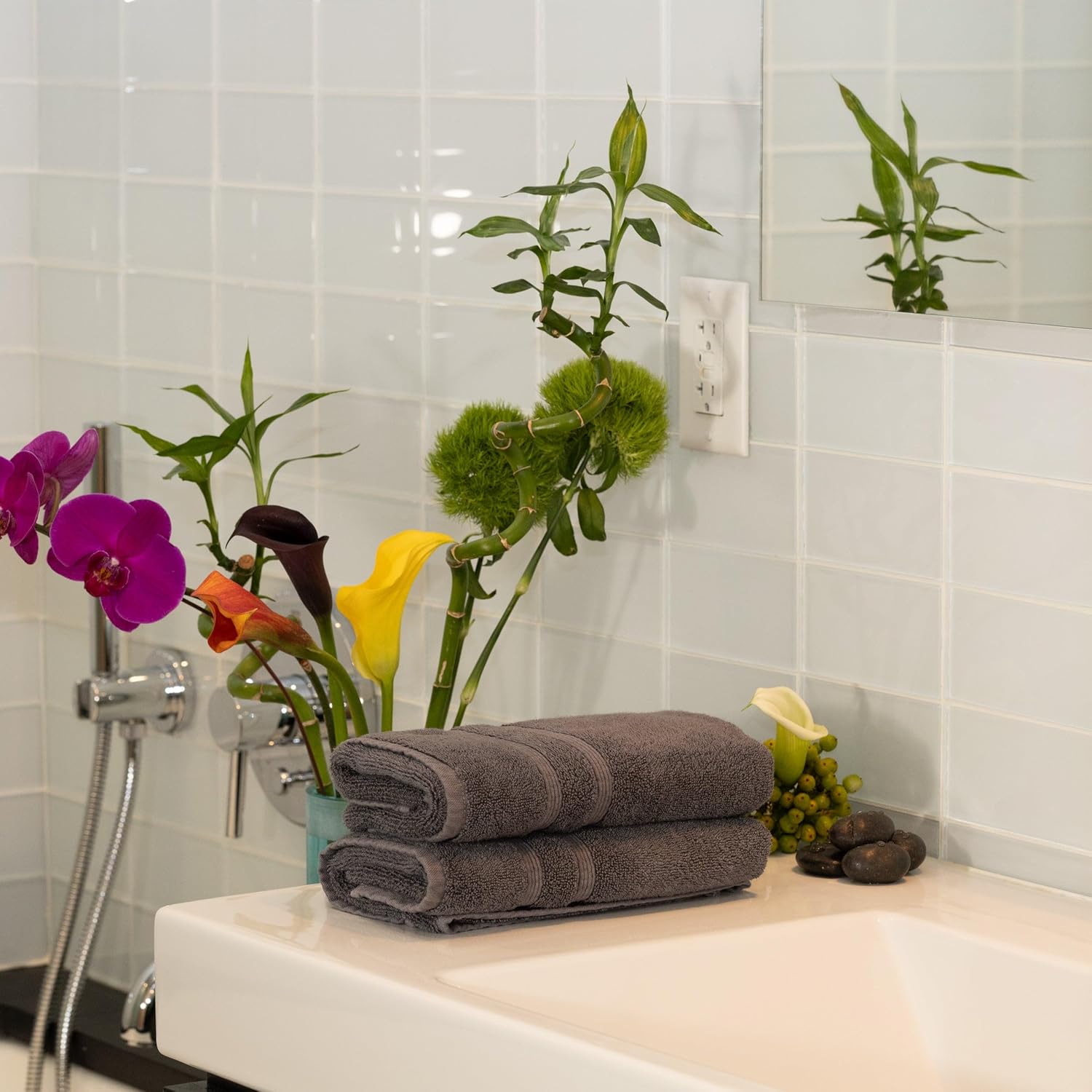 - 50% Viscose Made From Bamboo & 50% Aegean Turkish Combed Cotton, 700 GSM, Dobby Border, 2-ply Twisted Yarn – Carefully crafted with optimal weight and thickness to soak up water and comfort your skin. Double twisted yarns are spun out of extra-long fibers to ensure superior quality and performance. Buy individually or in Family Multi-Packs.