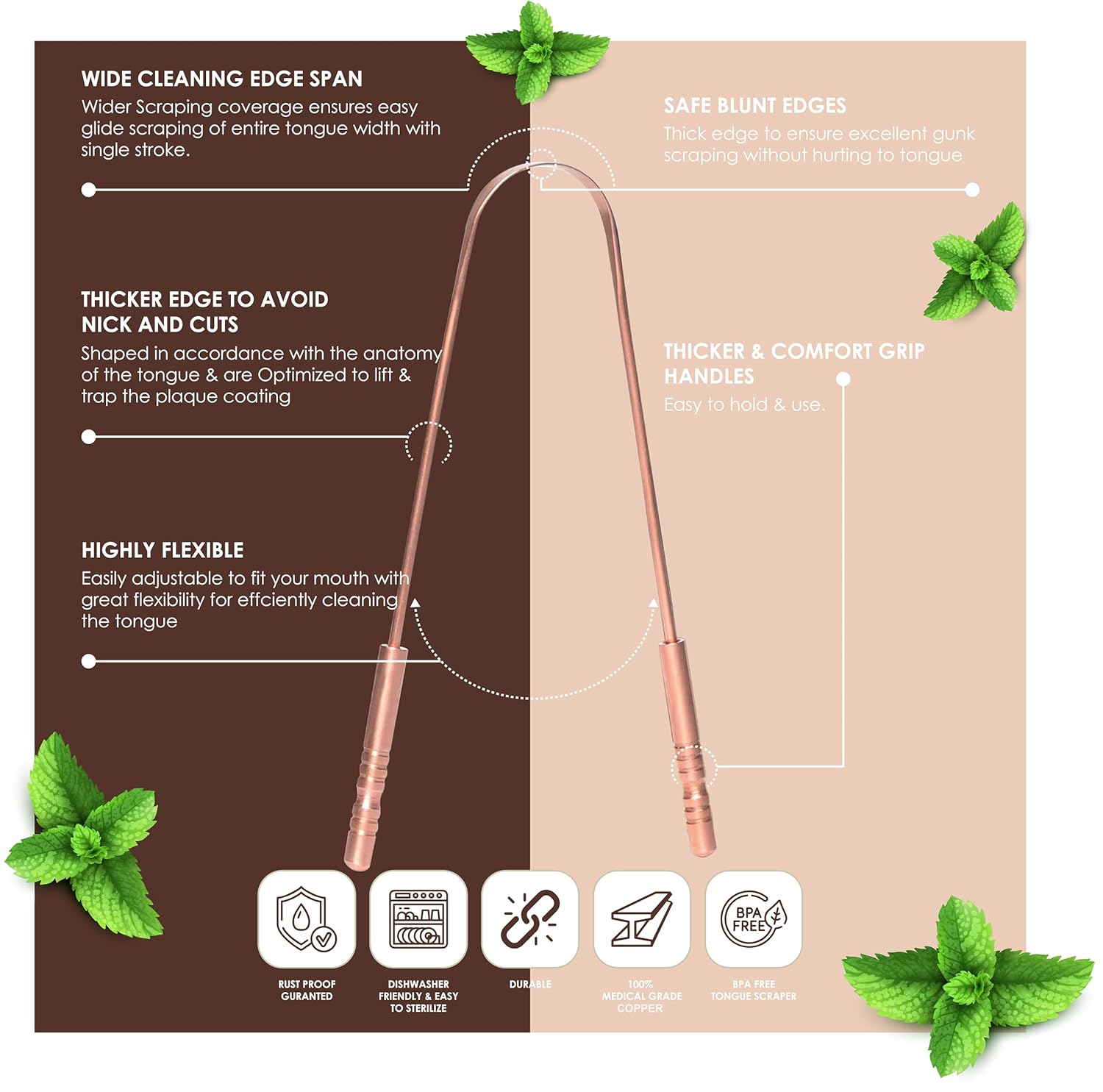 - ✅【100% COPPER TONGUE SCRAPER】- Unlike the plastic tongue scraper disposable that breaks, this tongue scraper features 100% natural copper metal for ultimate strength. Our premium quality U-shaped tongue scraper is rust proof, BPA-free, durable and long lasting. Ayurveda recommends using copper dental tools for improved sense of taste and oral health.