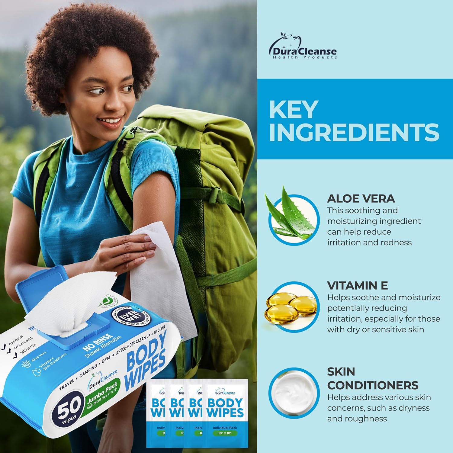 Dura Cleanse Body Wipes for Adults Bathing No Rinse (2 Pack) 100 XL Shower Wipes + 8 Travel Bath Sheets - 9" x 12" Extra Thick Waterless Adult Disposable Washcloths for Camping, Elderly Incontinence