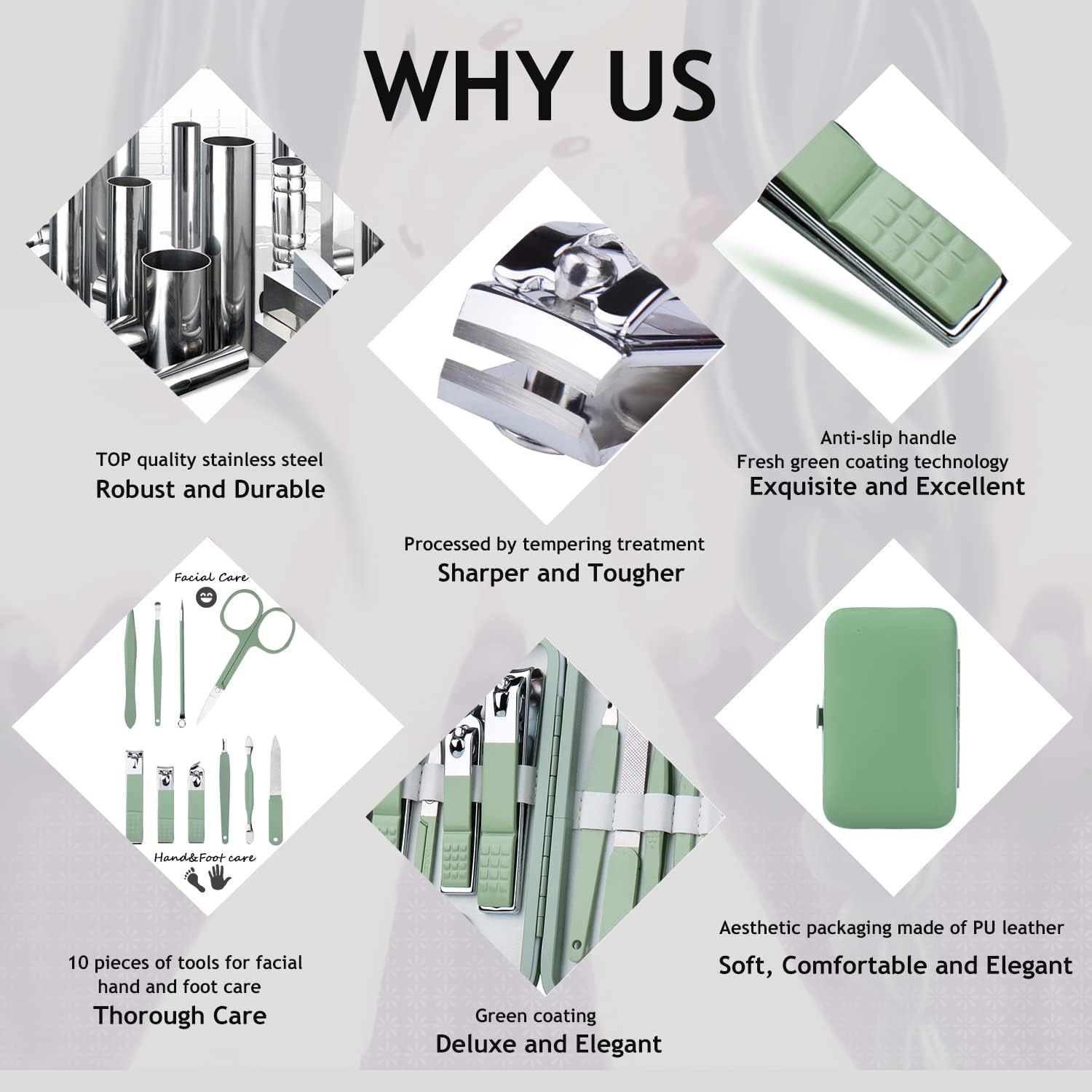 - UNIQUE JADE GREEN STYLE and PREMIUM QUALITY Made A REAL Difference: Crafted from top-quality stainless steel, HANTEKAS Professional manicure set is sturdy and durable,offering flawless performance and a lifetime use. What is more, the stylish and unique JADE GREEN combinations, which is first time to show on the market, gives it a glamorous look and make you outstanding from the crowd.