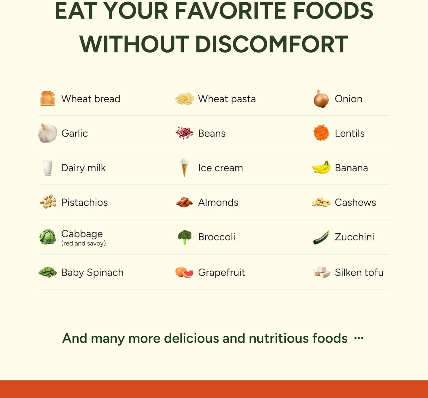 - POWERFUL ENZYMES: Our patent-pending formula includes a fructan hydrolase, which breaks down hard-to-digest fructans into simple sugars that are easy on your gut. Fructans are found in carbs like bread, fruits & vegetables.