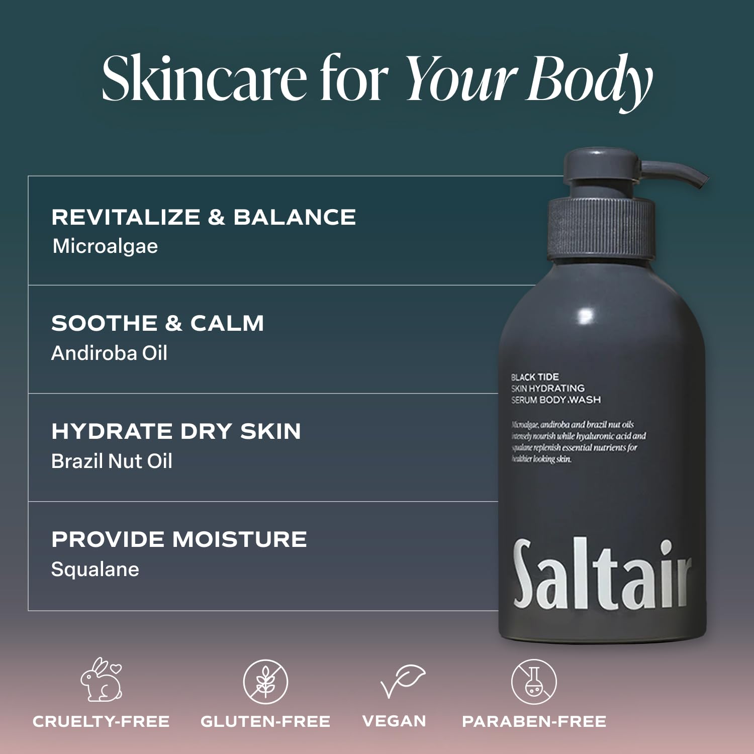 Saltair Body Wash, Black Tide 2-Pack. Moisturizing Body Cleanser with Monoi Oil and Cupuacu Butter. Luxury Shower Gel for Women and Men. Vegan, Cruelty-Free, Paraben-Free. 2x 17oz Pump Bottles