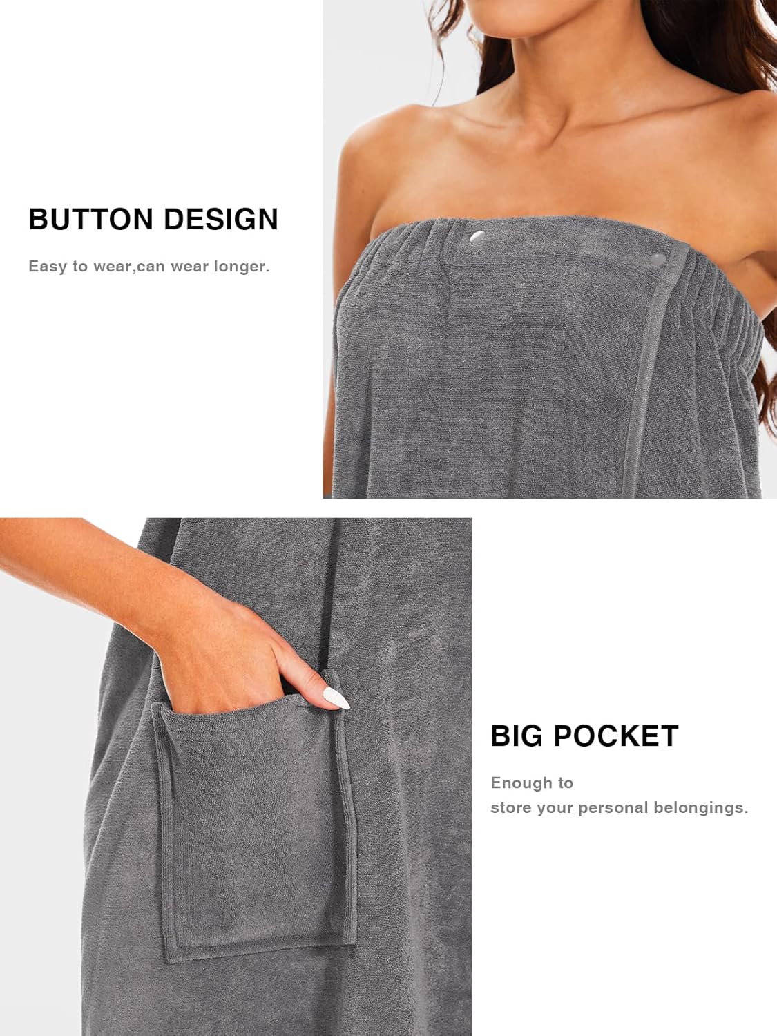 • Design with Pockets:Keys,cell phones or other personal items can be placed in the front packet.Hope this bath body wrap towels will make you have a better wearing experience.This ladies towel wrap robe is approximately knee-length for easier movement.