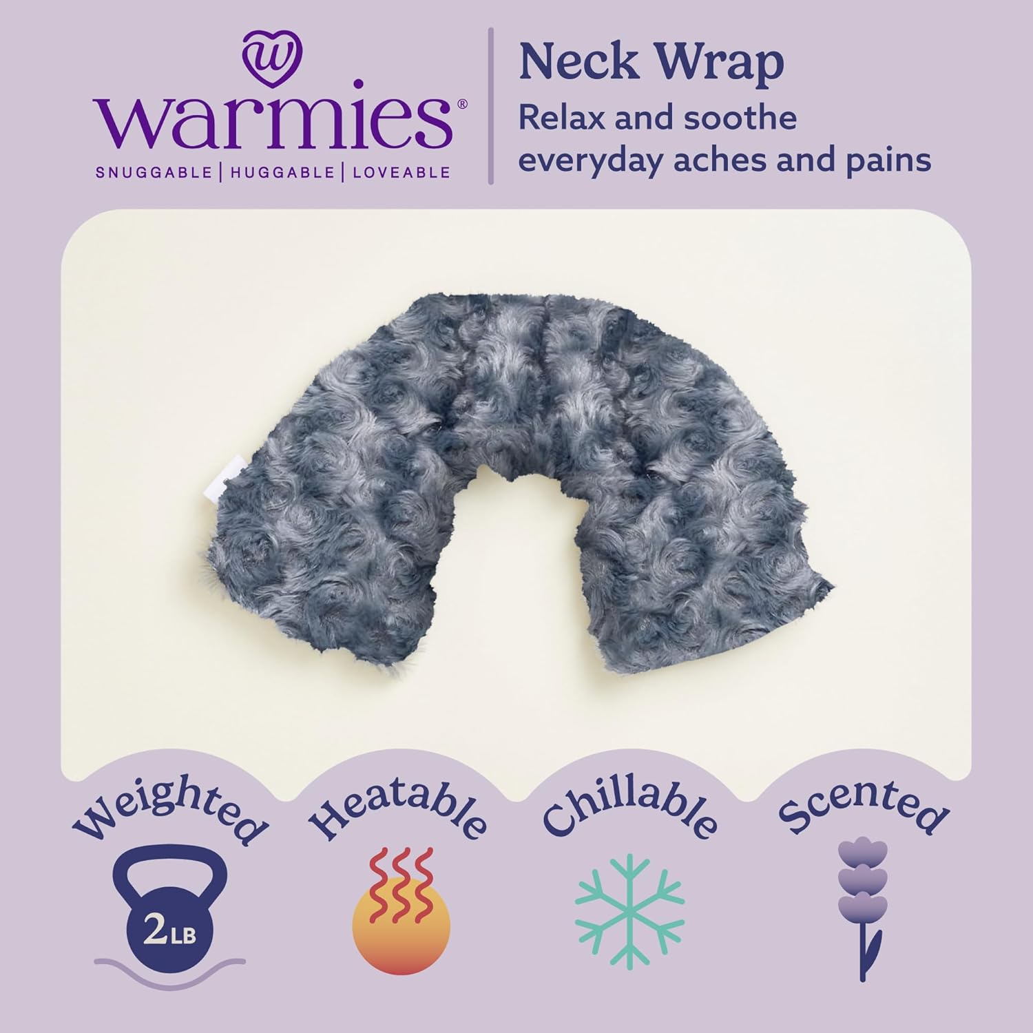 - Warmies Neck Wrap: This cozy Curly Gray Warmies Luxury Neck Wrap can be easily heated to provide up to two hours of soothing warmth and comfort, or chilled for a cooling sensation. Scented neck wrap is one-size-fits-most. 2 lbs.