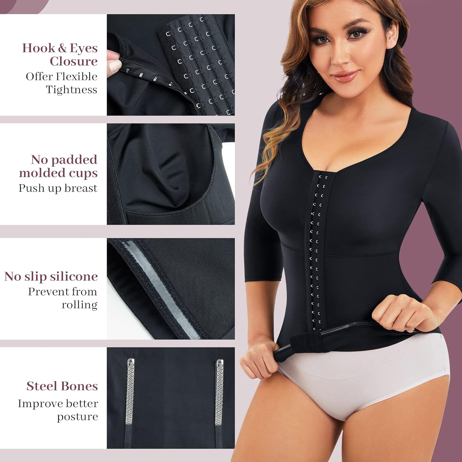 • No Pads Molded Cups: corset shapewear breast section use unique design, with no pads and wires, won’t hurt your incision but hold up your breast instead of flatting them. The pads around the cups of waist trainer corset offer comfy support and and help to lift up your chest, tone up your armpit fat to create a slimmer figure. You can wear your own bra with this women waist trainer shapewear top or not. It can effectively get people healed from chest surgery and prevent breast from snagging.