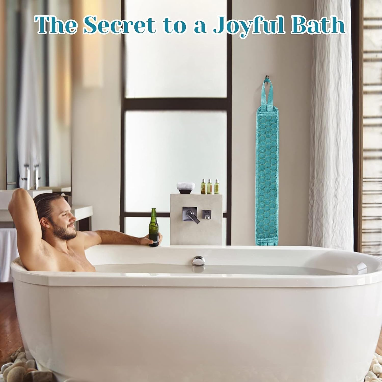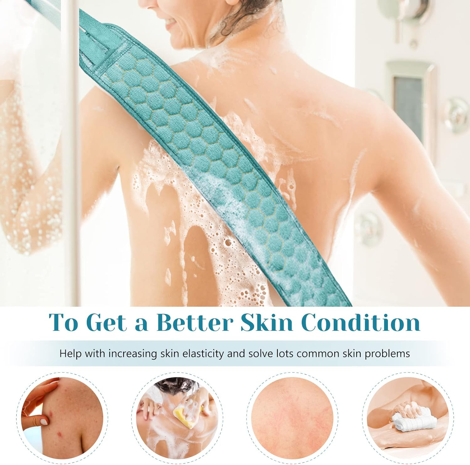 - ăExfoliating Shower Brushă: With 40 inches/100cm long, 3.9 inches/10cm width, our extra long silicone body scrubber is designed to replace traditional washing towel and loofah,which can make bathing more effortless and more suitable for people with larger body.