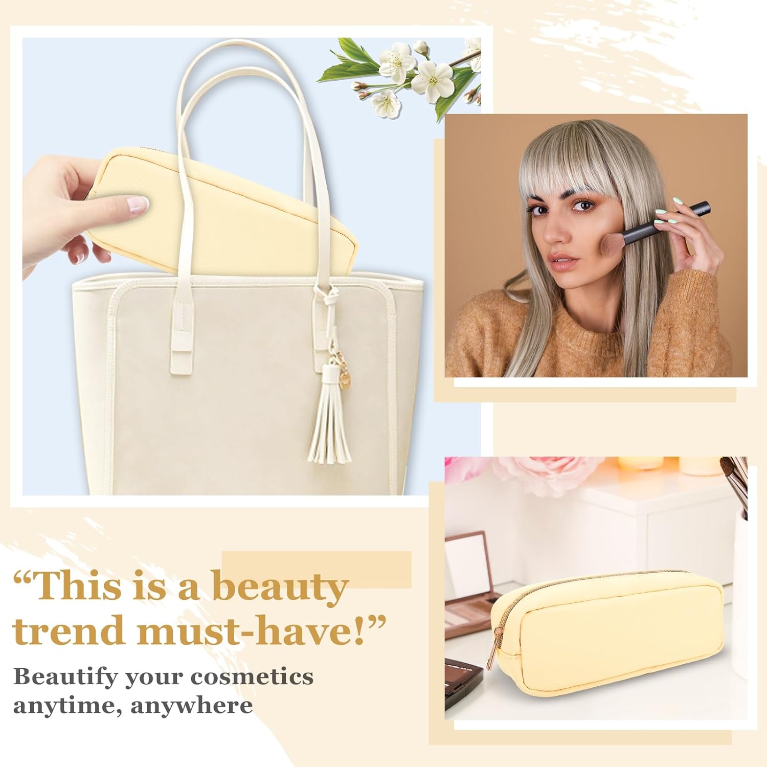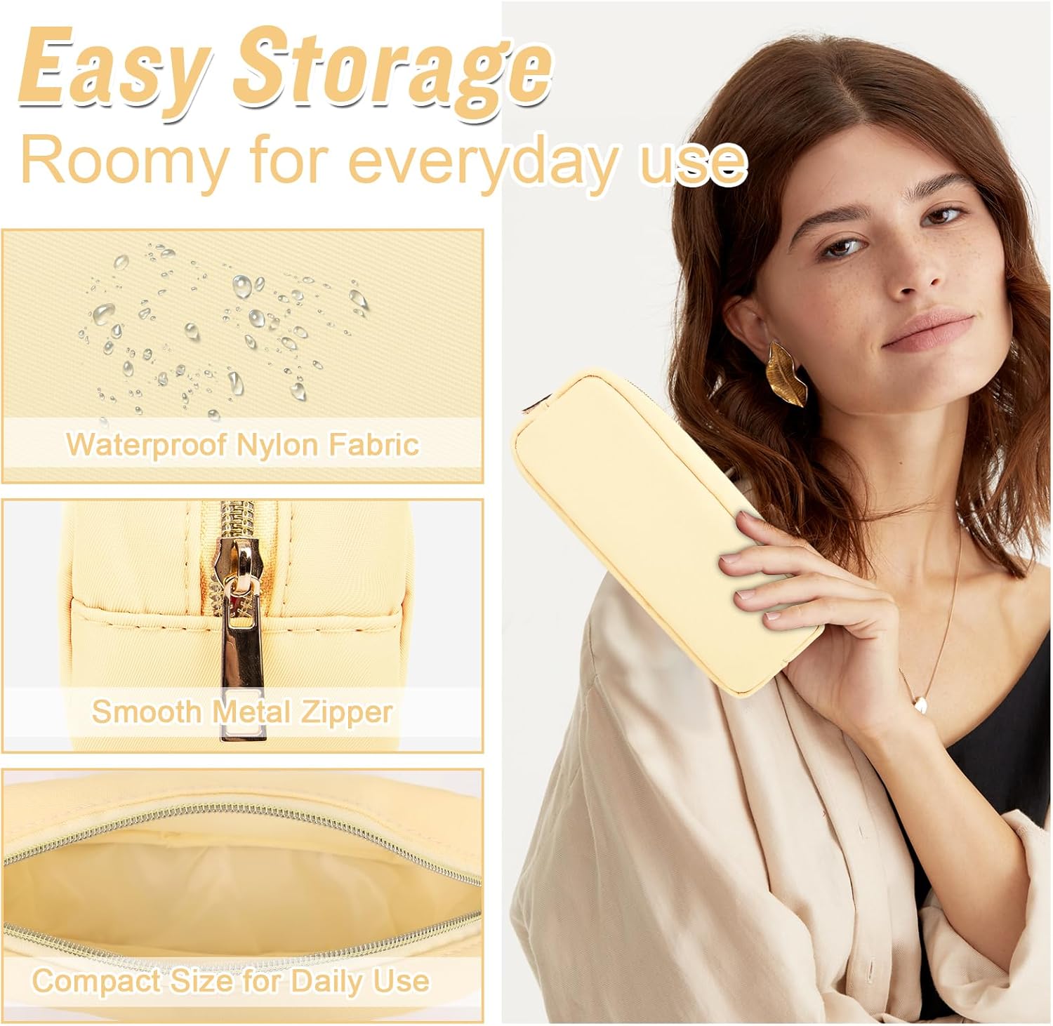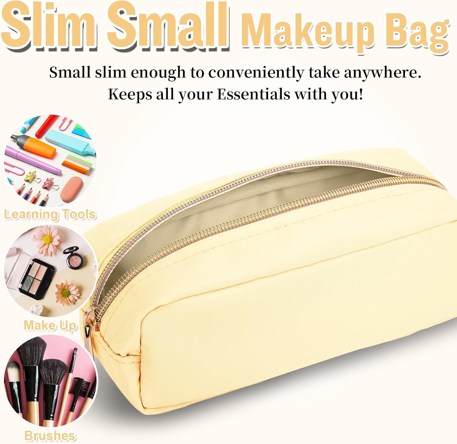 izuzta Nylon Small Makeup Bag Slim Pouch, Preppy Cute Makeup Brush Case Bag Cosmetic Zipper Pouch for Purse, Waterproof Travel Toiletry Bag Clutch Coin Pouch Makeup Organizer for Women Girls(Beige)