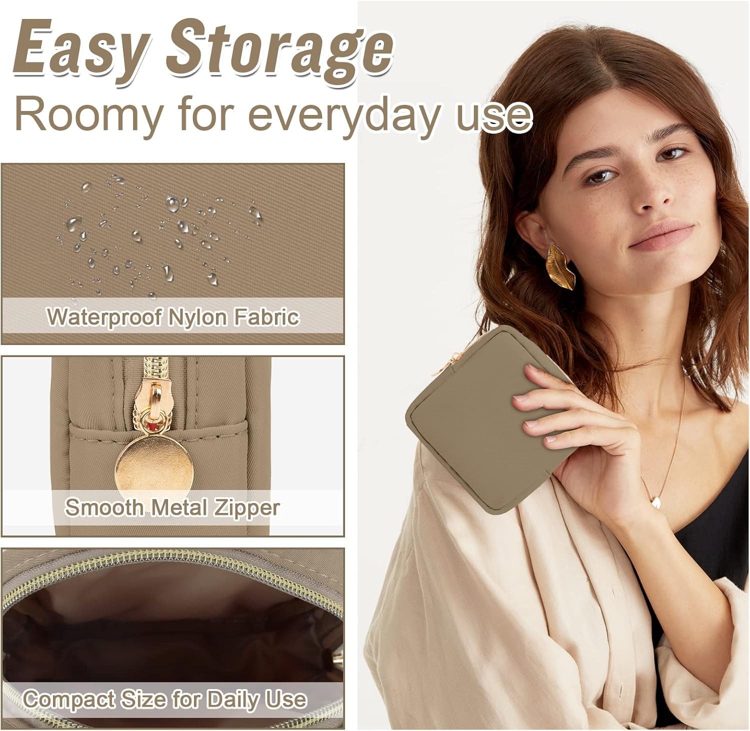 Nylon Mini Makeup Bag for Purse, Preppy Small Cute Makeup Bag Cosmetic Zipper Pouch Purse, Waterproof Travel Coin Pouch Sanitary Napkin Storage Bag Clutch Makeup Organizer Pouch for Women Girls(Khaki)