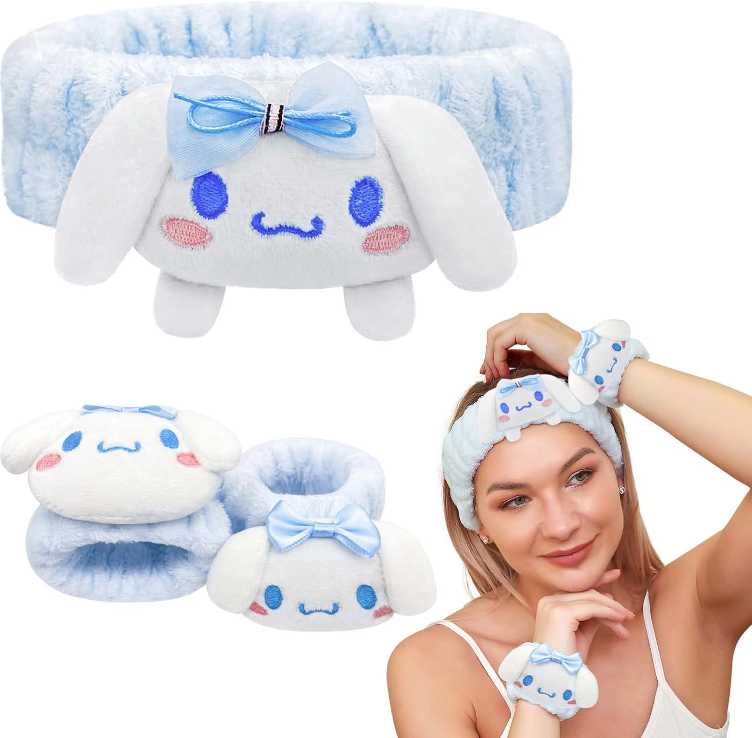 Kawaii Spa Headband and Wristband Set for Face Washing, Cute Soft Skincare Headbands for Women Girls, Fluffy Makeup Headband for Washing Face, Bath, Shower, Beauty