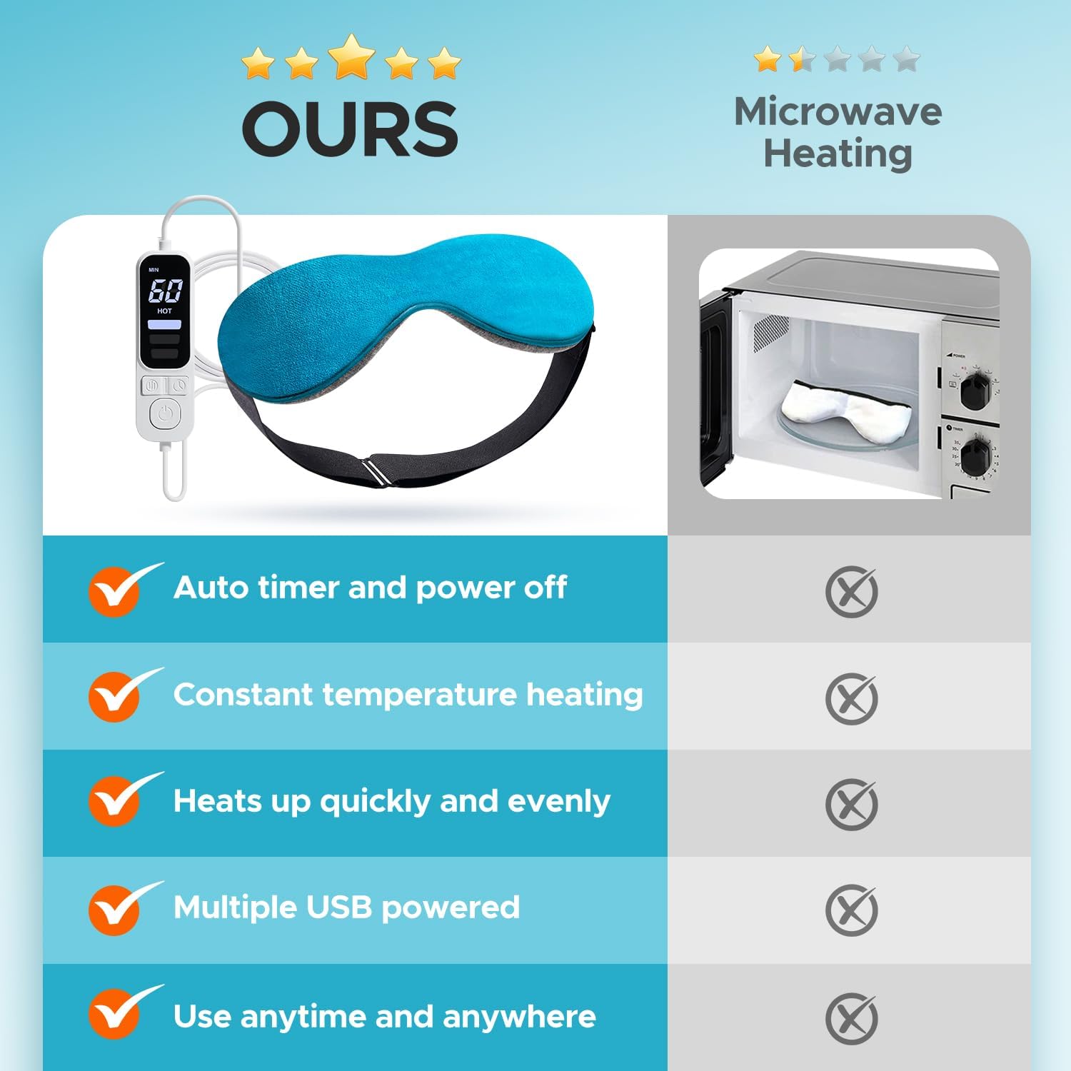 - Adjustable Temperature & Timer: It's designed with 3-level heat from 104℉ to 140℉ and a 4-level timer 15-60mins, which allows you to choose the ideal temperature and time according to your convenience.Tired of your microwave eye mask not getting hot after a few minutes? Our reusable heated eye masks provide continuous heat for dry eye relief and are more convenient than steam eye masks and microwave eye masks.