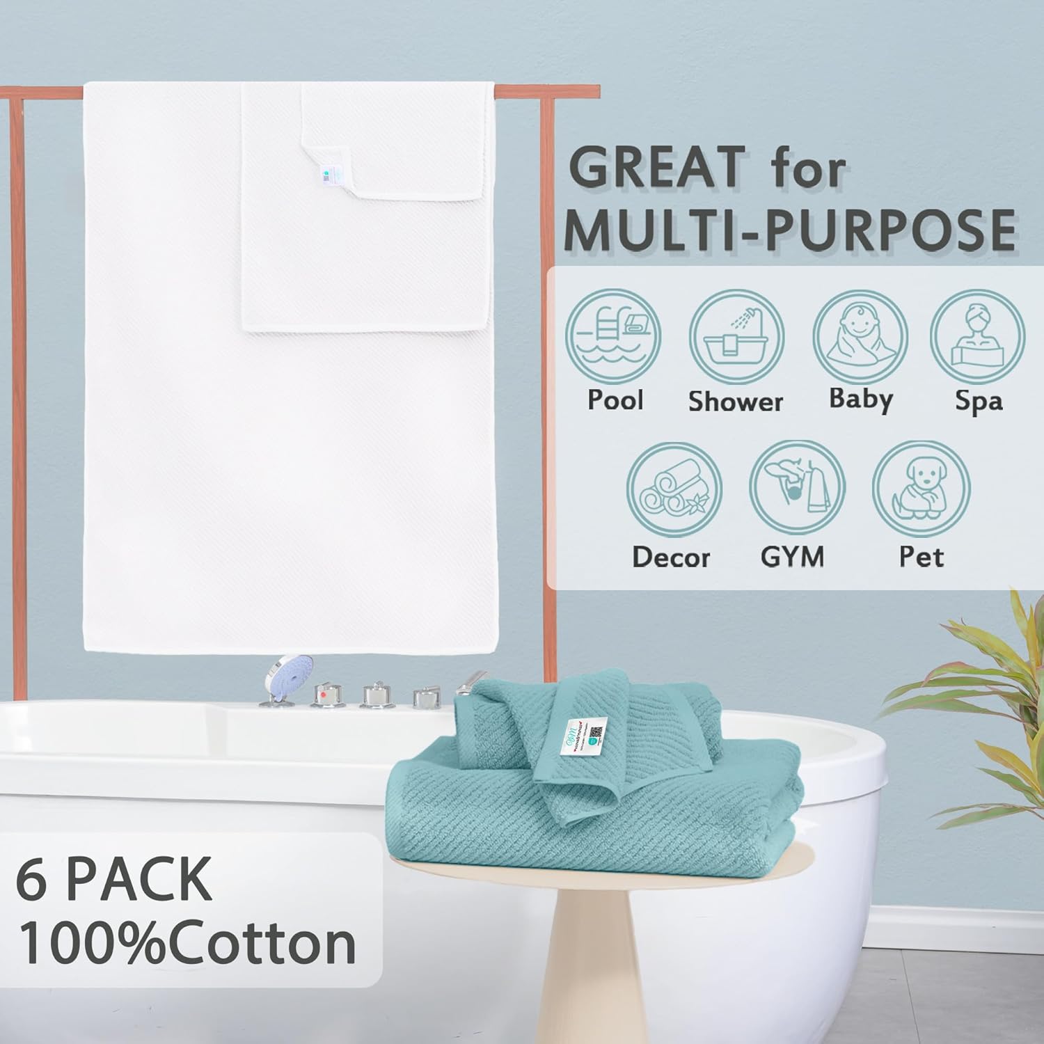 VOOVA & MOVAS Towels for Bathroom - 100% Cotton | Soft | Quick Dry | Thick, Towel Set of 6, 2 Large Bath 30"x56",2 Hand 18"x28", 2 Washcloths 13"x13", Bathroom Essentials, Aqua Teal and White